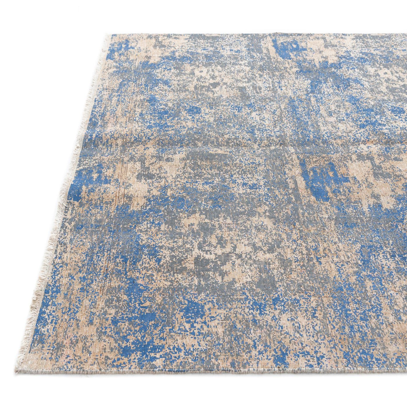 This Ultra Vintage collection rug, measuring 6x9 feet, is hand-knotted from 100% wool, displaying a balance of durability and tactile comfort. The rug features a robust blue background, complemented by a visually intriguing pattern of brown, ivory, and gray hues which collectively impart a sense of depth and history. The texture of the rug is luxuriously soft to the touch, a testament to its high-quality wool and craftsmanship.