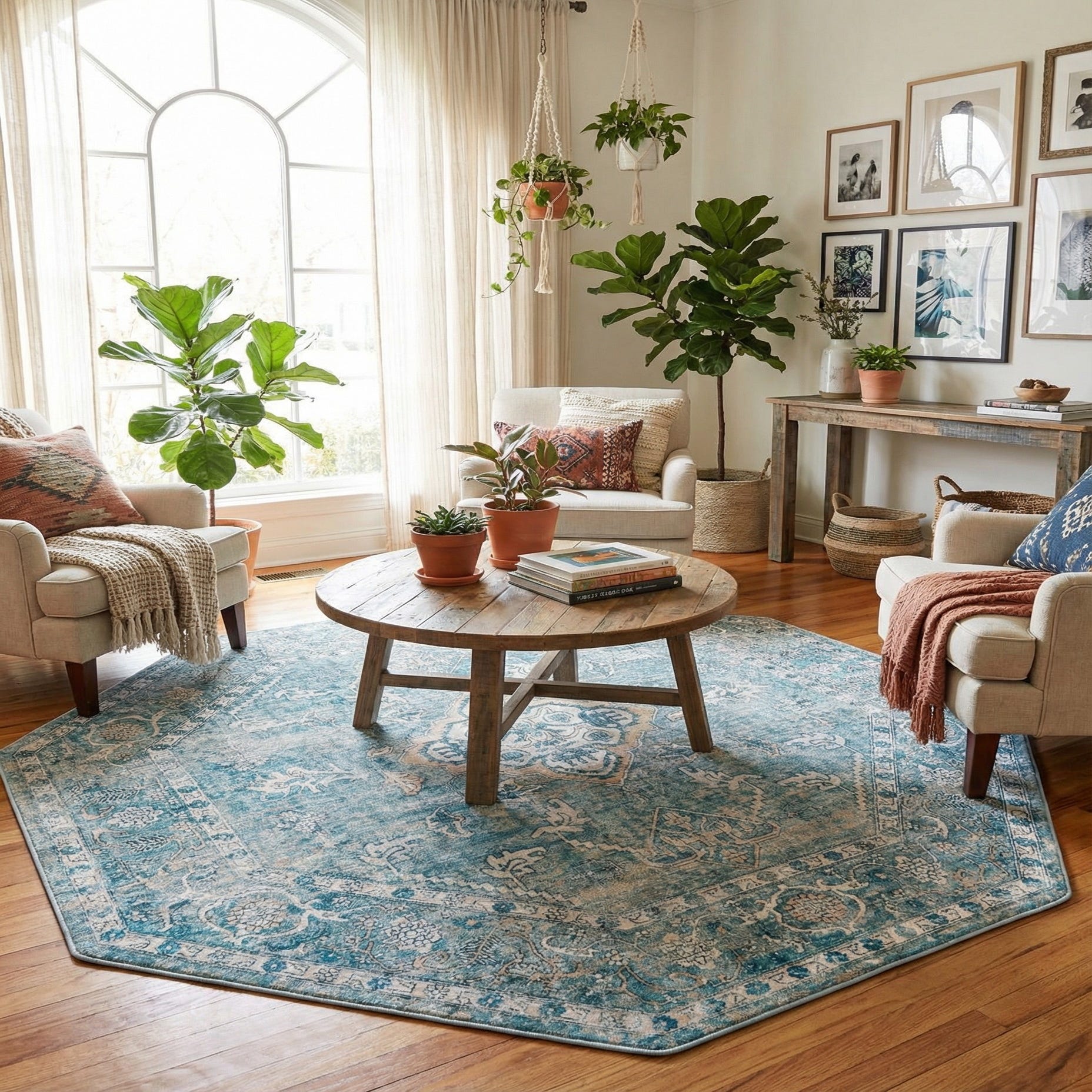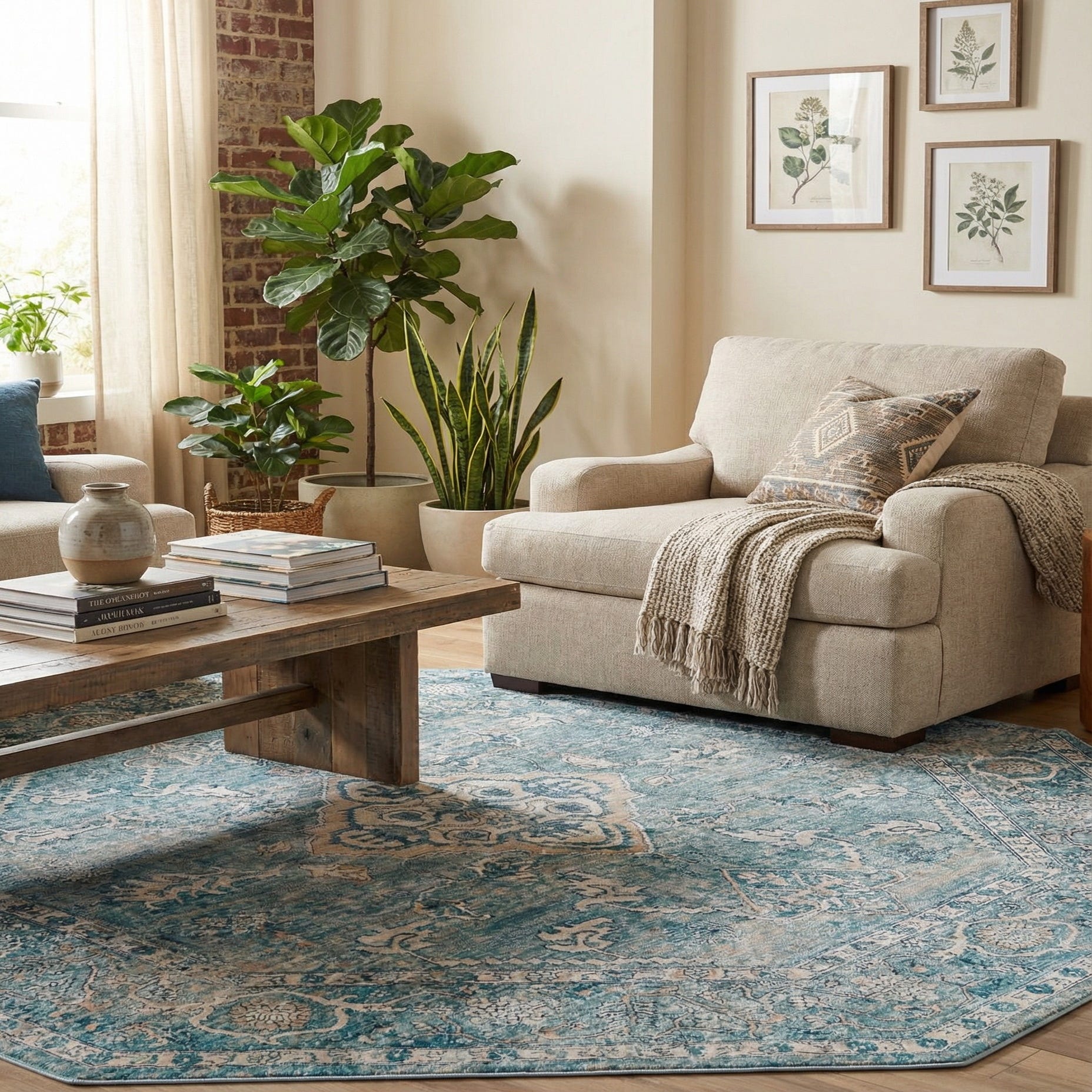 An octagonal medallion rug with a softly distressed, vintage-inspired look. A blue field forms the background while light blue highlights and light brown accents trace a central medallion, scrolling vines, and a detailed inner border. Traditional floral motifs and stepped corner elements give the piece a classic feel without feeling heavy — the color palette keeps the overall effect fresh and calming.