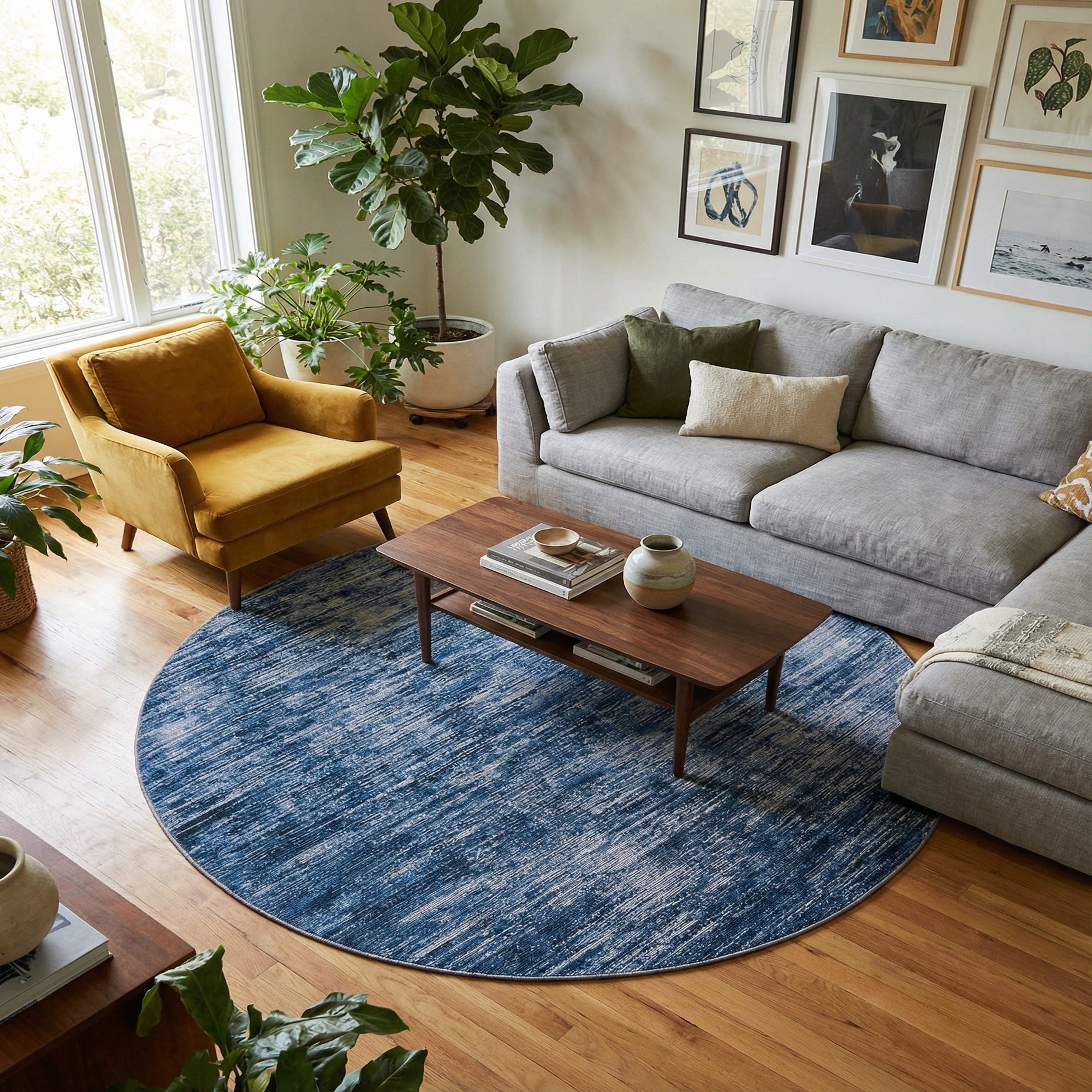 Place this rug to anchor a seating area, under a round dining table, or to warm a bedroom or home office. Its blue base and neutral ivory and black accents pair well with light woods and cool metals for contemporary or coastal-inspired rooms, and it also complements transitional schemes where texture and tone tie diverse furnishings together.