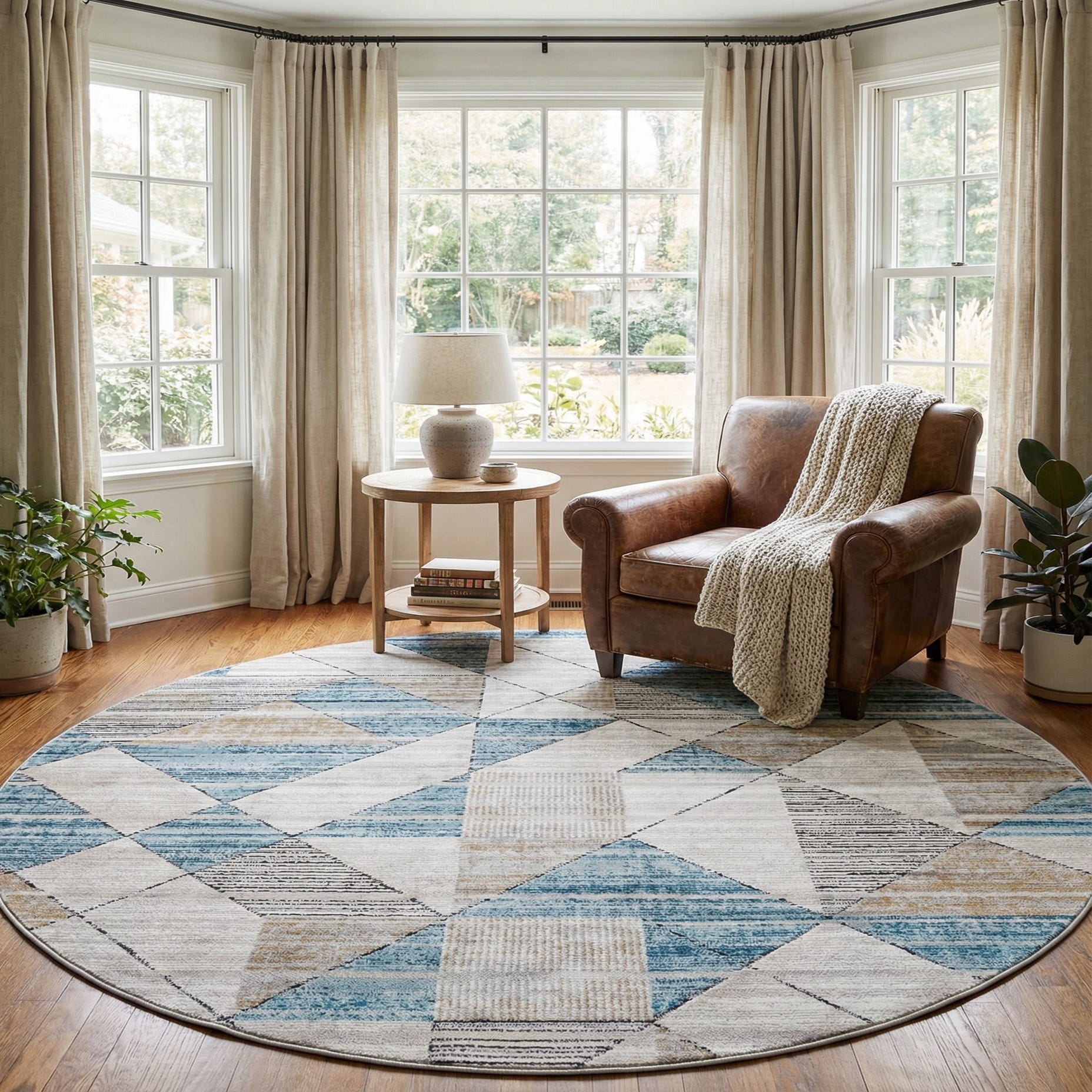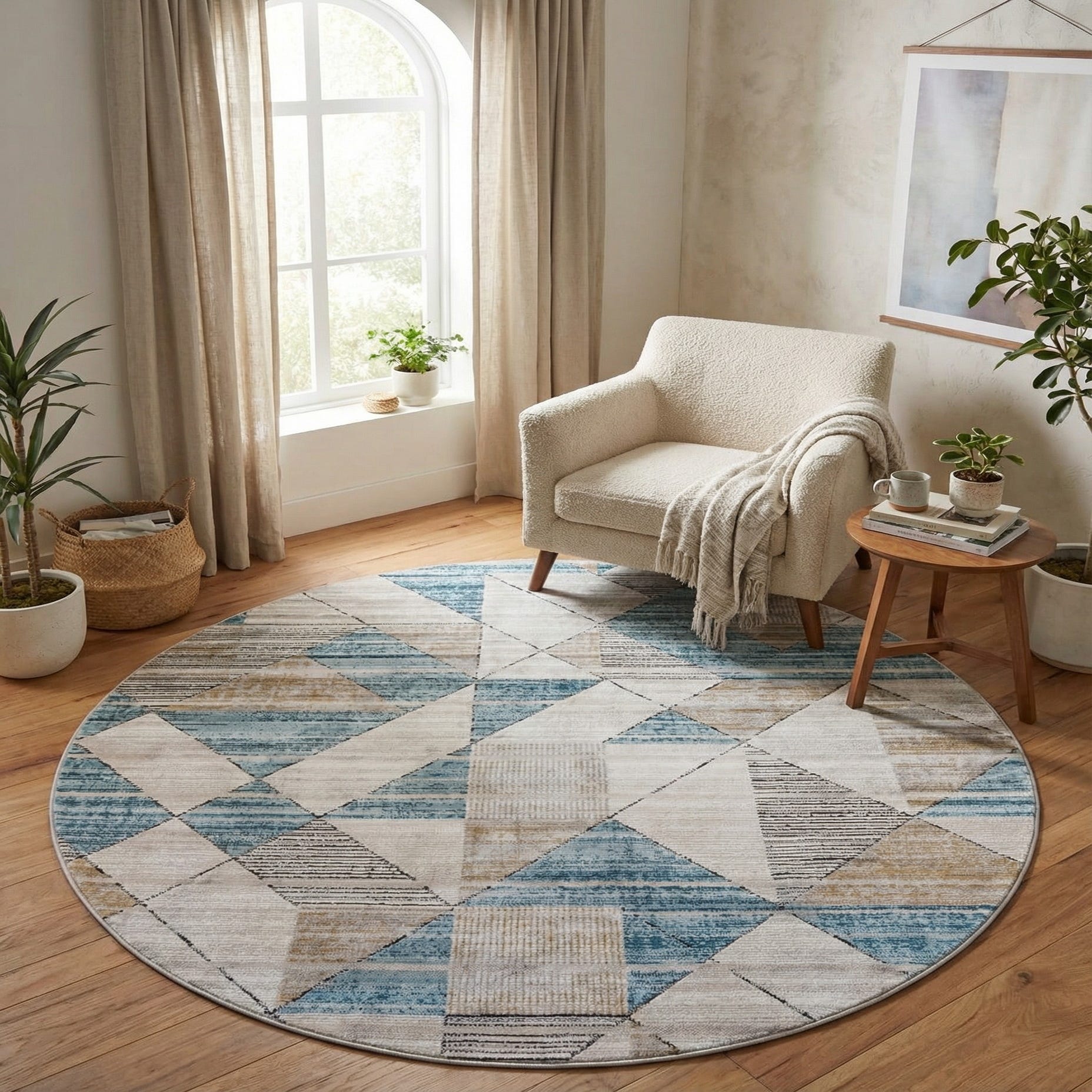 This rug's versatile color palette and crisp pattern make it suitable for a range of interior designs, from modern and minimalist spaces to more eclectic and transitional environments. Its round shape is ideal for anchoring furniture in a living room or adding a focal point in spacious entryways. Additionally, the stain-resistant and shed-free properties ensure this piece combines style with practicality, making it a sensible choice for high-traffic areas and homes seeking a balance of aesthetics and function.