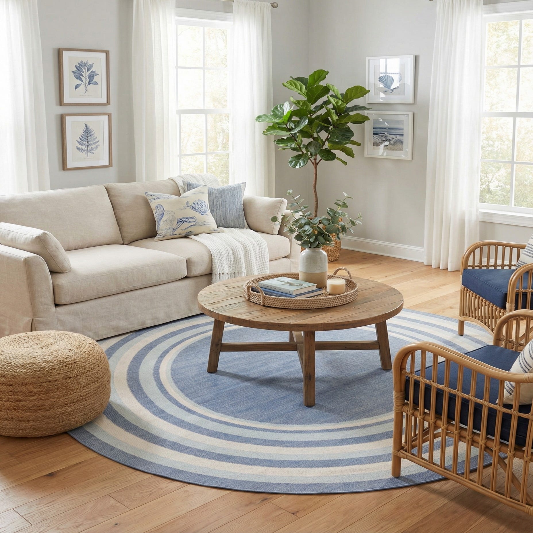 Machine-made from 100% polypropylene, the rug has a low-profile, tightly woven surface that lies flat underfoot and displays the ring pattern with clear, even edges. Use this piece to define a round dining setting, anchor a seating group in a coastal or contemporary living room, or add a layered touch to a bedroom with white or light-wood furnishings. It pairs naturally with navy accents, woven textures, and soft linen upholstery for a relaxed, put-together look.