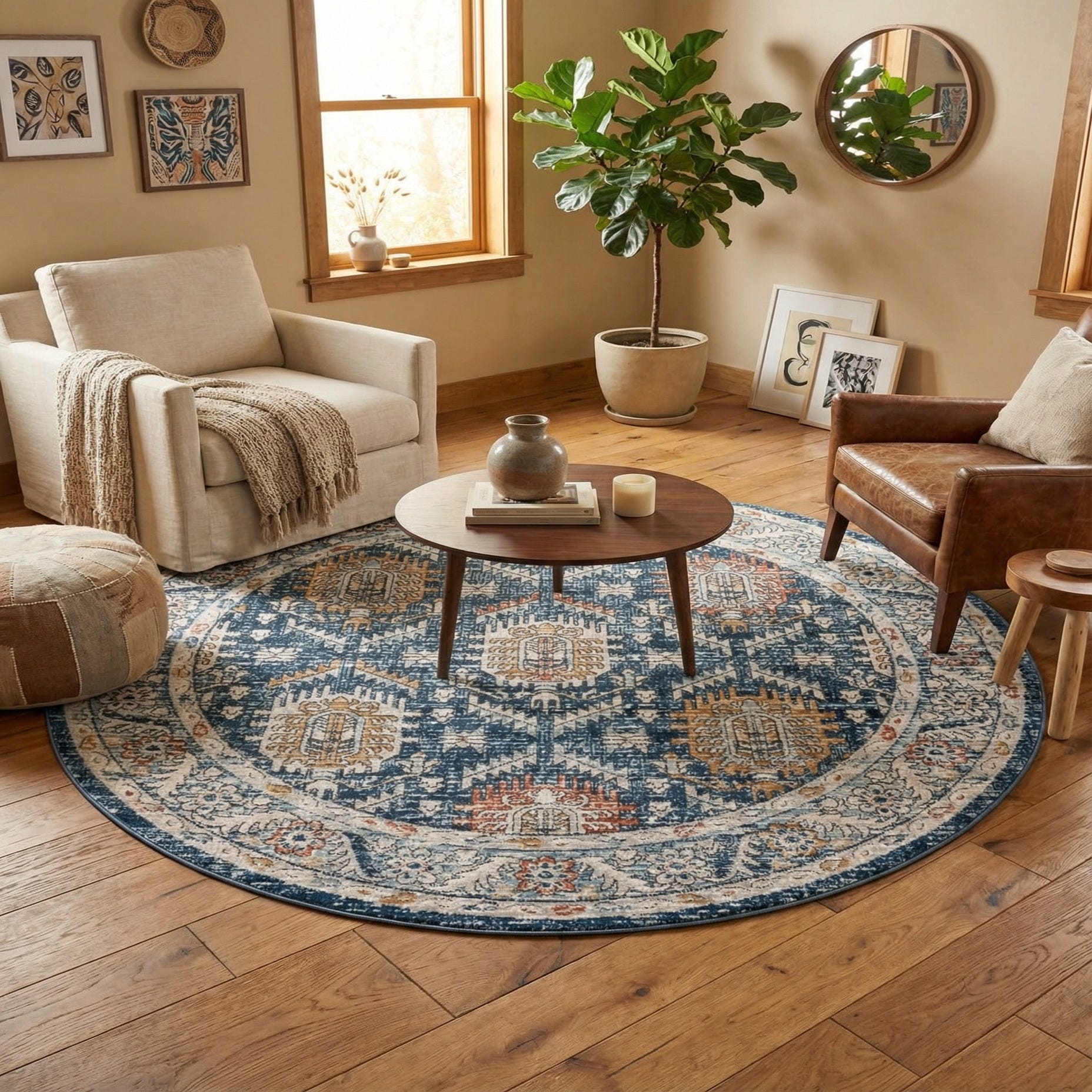 Place this rug under a round dining table or centered beneath a seating group to anchor the room. It pairs naturally with navy or light-gray upholstery, weathered oak or painted white furnishings, and mixed-metal accents — ideal for transitional living rooms, coastal-inspired bedrooms, or a modern farmhouse breakfast nook where the warm and cool hues bring different materials together.