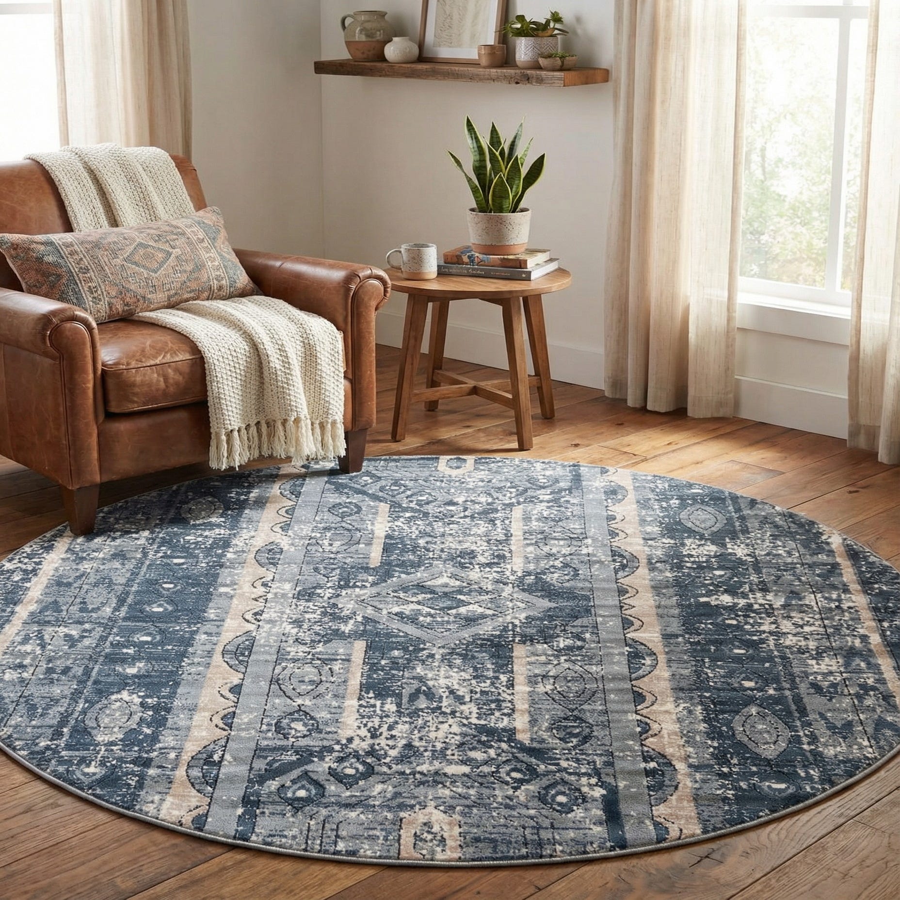 A relaxed, vintage-inspired pattern anchors this round rug with layered geometric motifs and vertical banding. The blue background provides a cool, even field for faded medallions, scalloped borders and subtle diamond accents in shades of beige, gray and ivory. Machine-made construction in an 85% polypropylene / 15% polyester blend creates a low-profile pile with a soft, slightly lustrous hand; the surface feels smooth underfoot and the printed, distressed finish gives the design a lived-in, textured look without raised fringe.