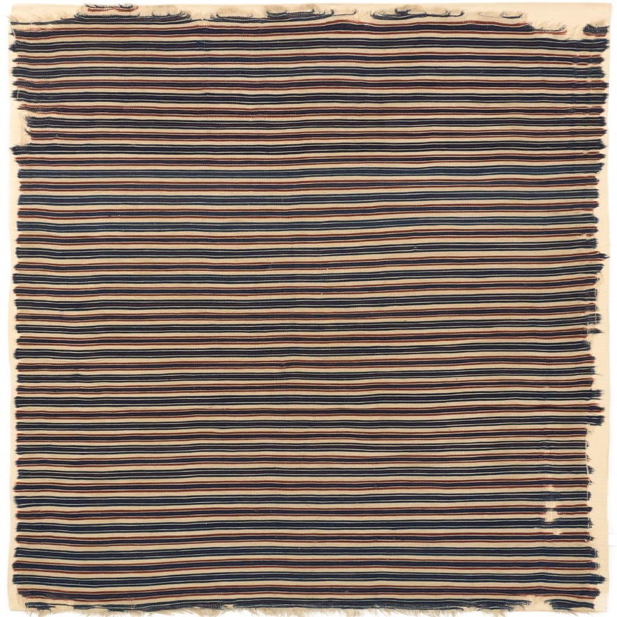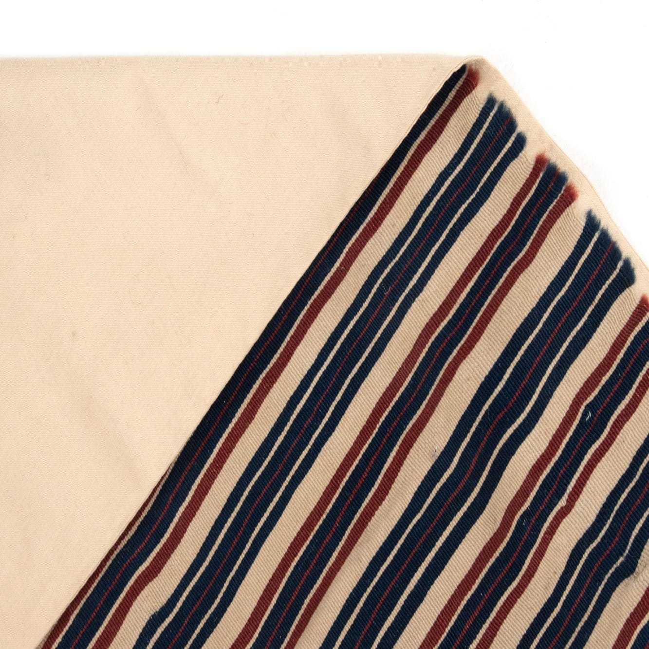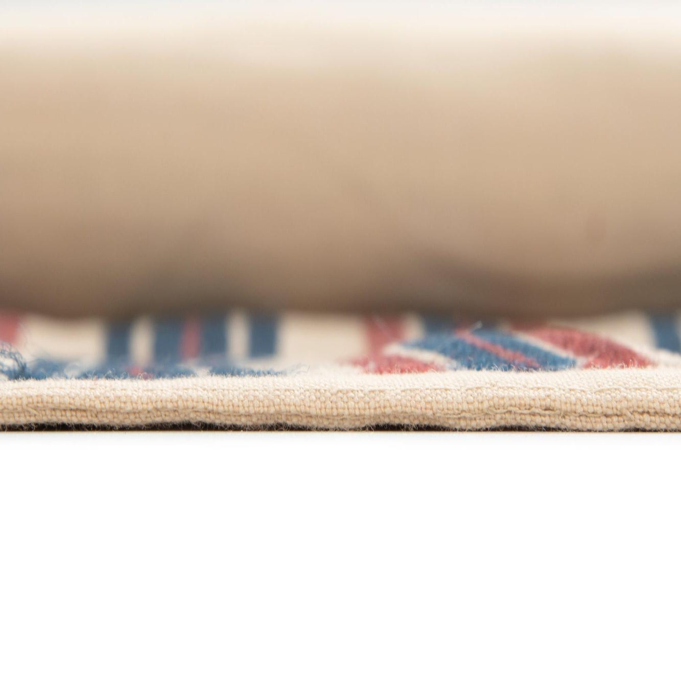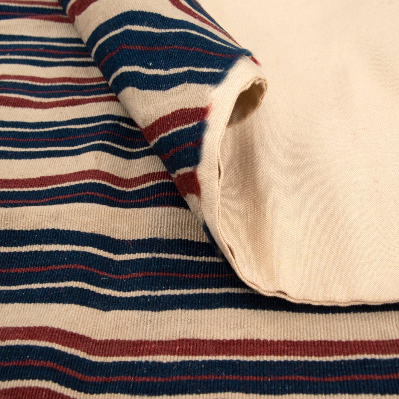 A handmade 7 Ft runner rug with alternating thin blue, red, and cream stripes, suitable for a hallway.