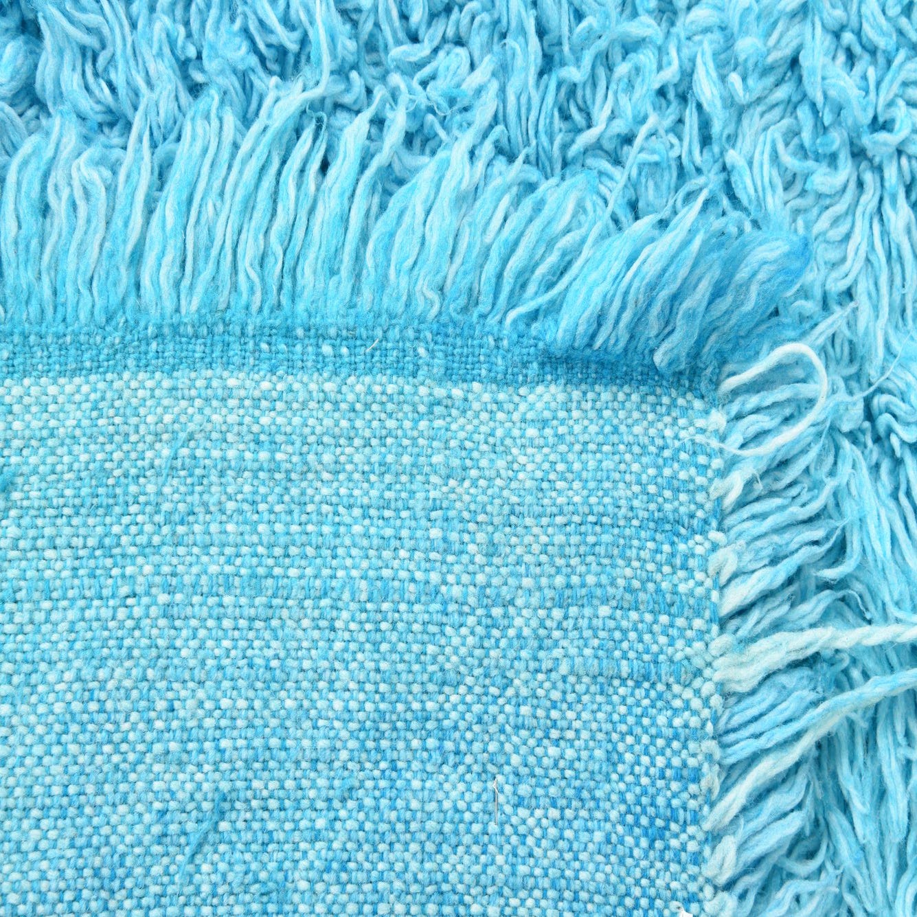 The rug's uniform blue background exhibits a deep, rich hue that captures attention and can serve as a bold statement piece in any interior space. While lacking a distinct pattern, the consistent color and tactile surface of this rug provide versatility in styling. Due to its texture and color, this rug lends itself well to modern, contemporary, or bohemian decor styles, where it can add a touch of color and warmth. It can be strategically placed in hallways, entryways, or alongside a bed in a bedroom to add visual interest and a soft touch to bare floors. The saturated blue color coordinates with various color schemes, whether you're working with neutral tones to create a contrast or with complementary colors for a harmonious design.