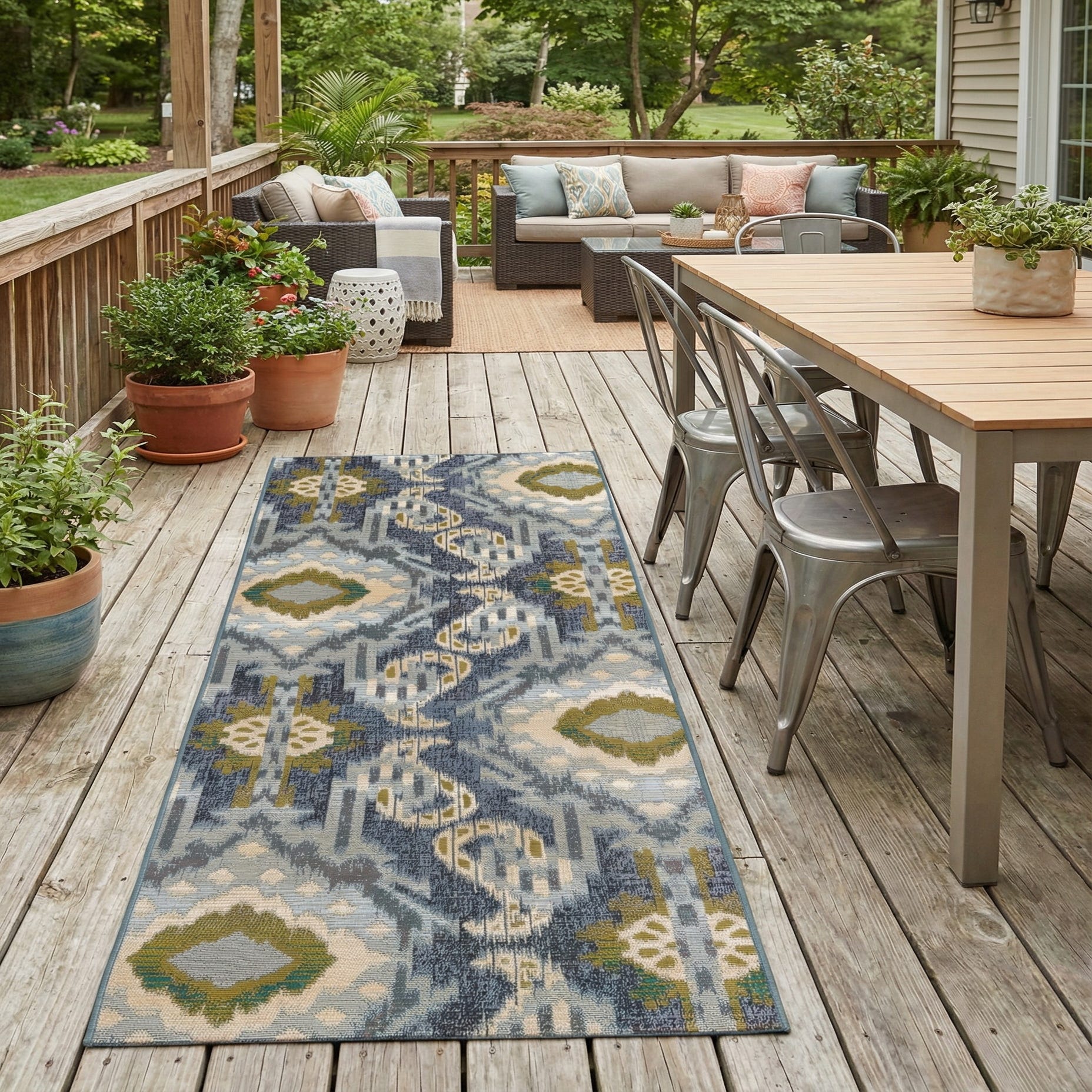 The rug's flatweave construction contributes to a smooth texture that can endure high-traffic areas, making it an ideal choice for both outdoor spaces and interiors that bridge the indoor-outdoor living concept. Its stain-resistant and shed-free properties make it a practical addition to homes with pets.