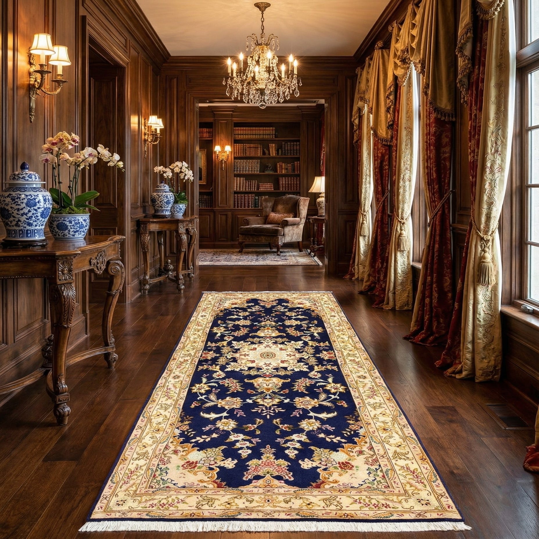 A 7 ft runner rug in a traditional Persian style, featuring a deep navy blue field with an intricate floral medallion and a cream border with complementary floral motifs.