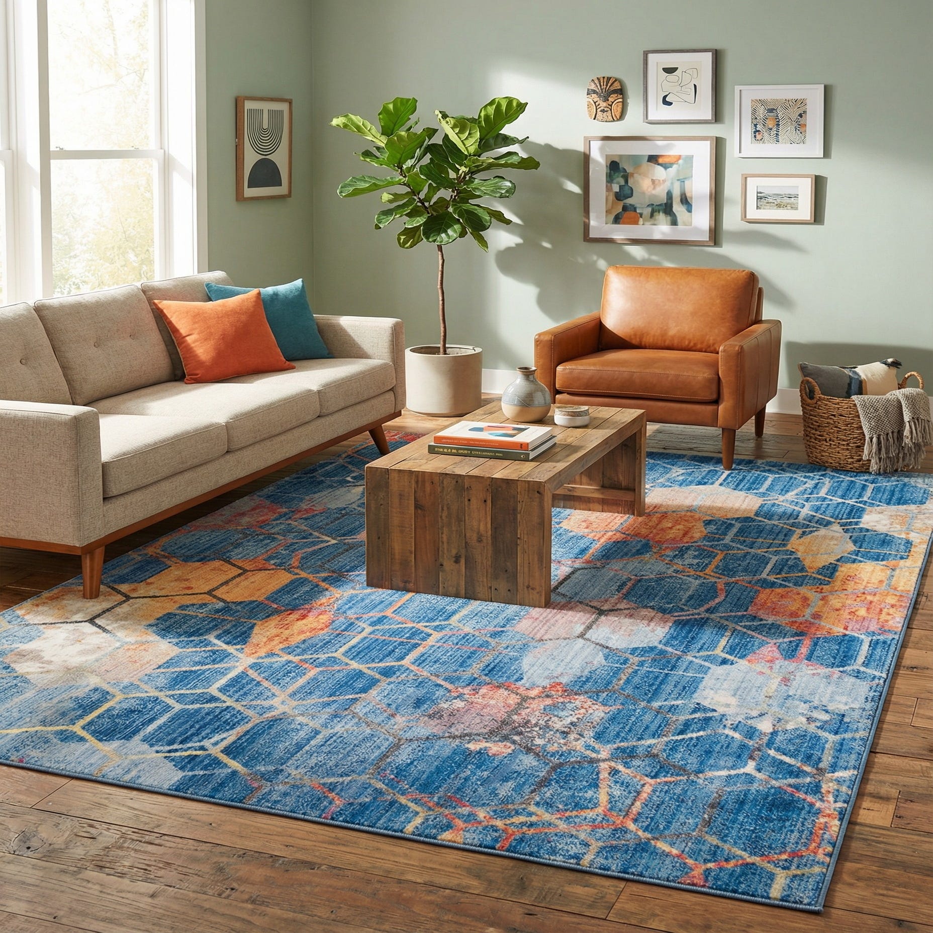 A bold geometric honeycomb pattern sits against a blue background, where overlapping hexagons create a layered, modern grid. The design balances crisp navy outlines with painterly, distressed fills in beige, gold, orange and peach, and gentle vertical striations give the surface added depth. Running your hand over the rug reveals a soft, low-profile pile with a subtle sheen from the space-dyed polyester yarn; the color variation in the yarn produces a slightly variegated, almost watercolor effect that adds visual movement without heavy texture contrast.