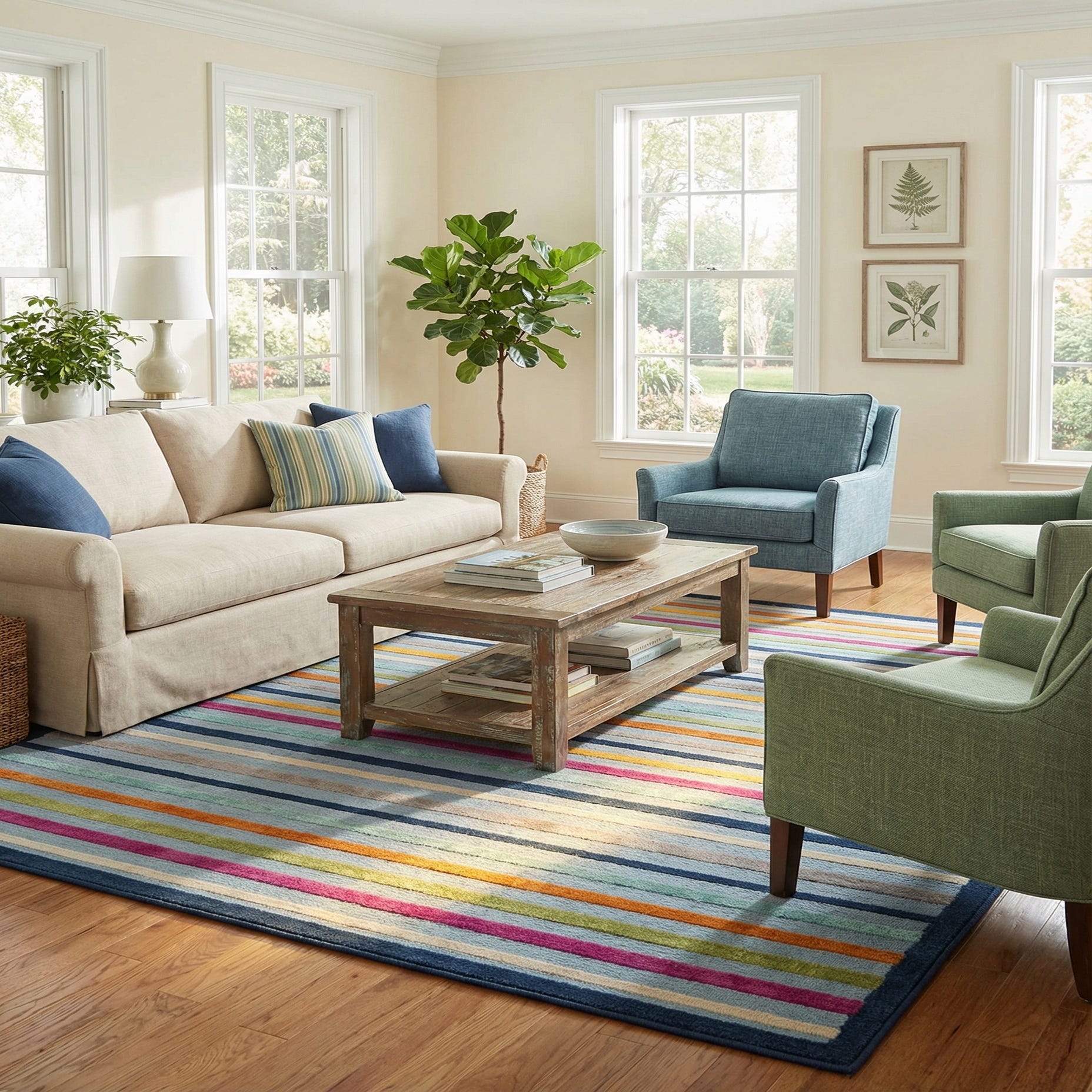 A 7x10 rectangular indoor/outdoor rug featuring vibrant multi-colored stripes on a blue background, with a dark blue border.