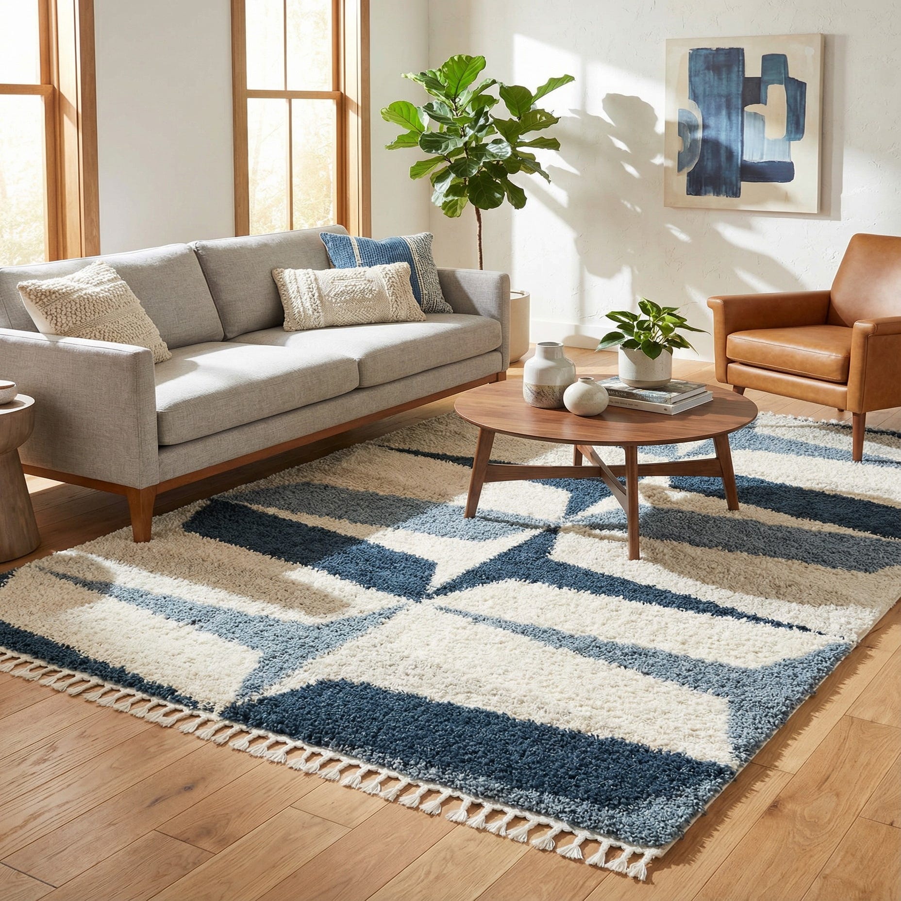 Machine-made construction gives consistent texture and color across the field. Place this rug to anchor a living room seating area, layer it beneath a low-profile bed in a coastal or contemporary bedroom, or use it to add warmth and pattern to a modern home office. It coordinates nicely with light wood tones, crisp white accents, and navy or gray upholstery for a calm, collected palette.