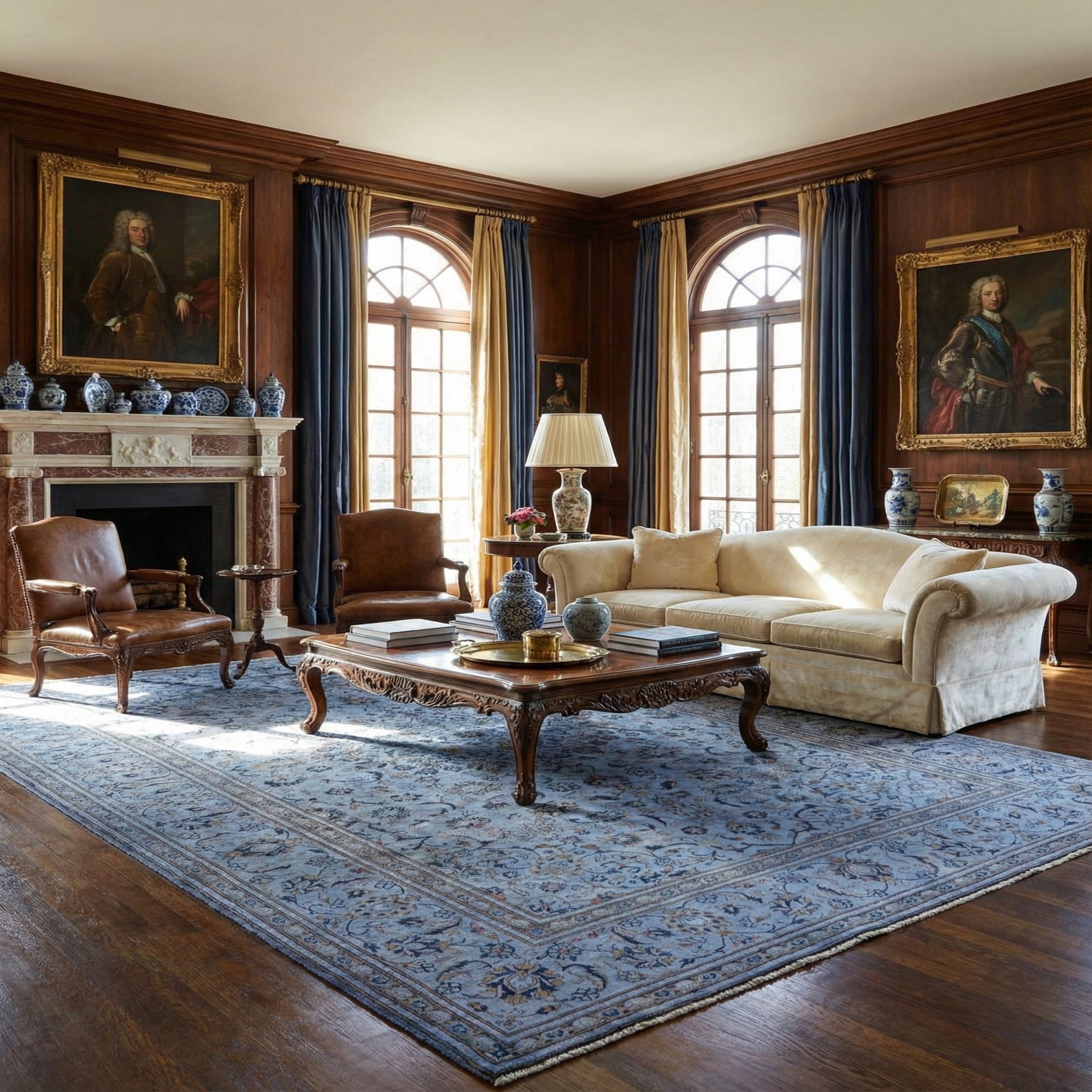 A 7x10 rectangular blue traditional wool rug with intricate floral patterns and a detailed border, perfect for a living room.