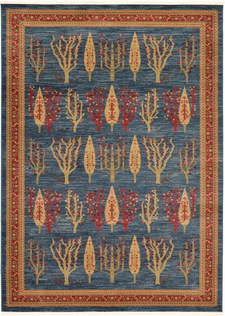 Primary color is Blue. Colors in this rug include: Blue, Red, Tan.