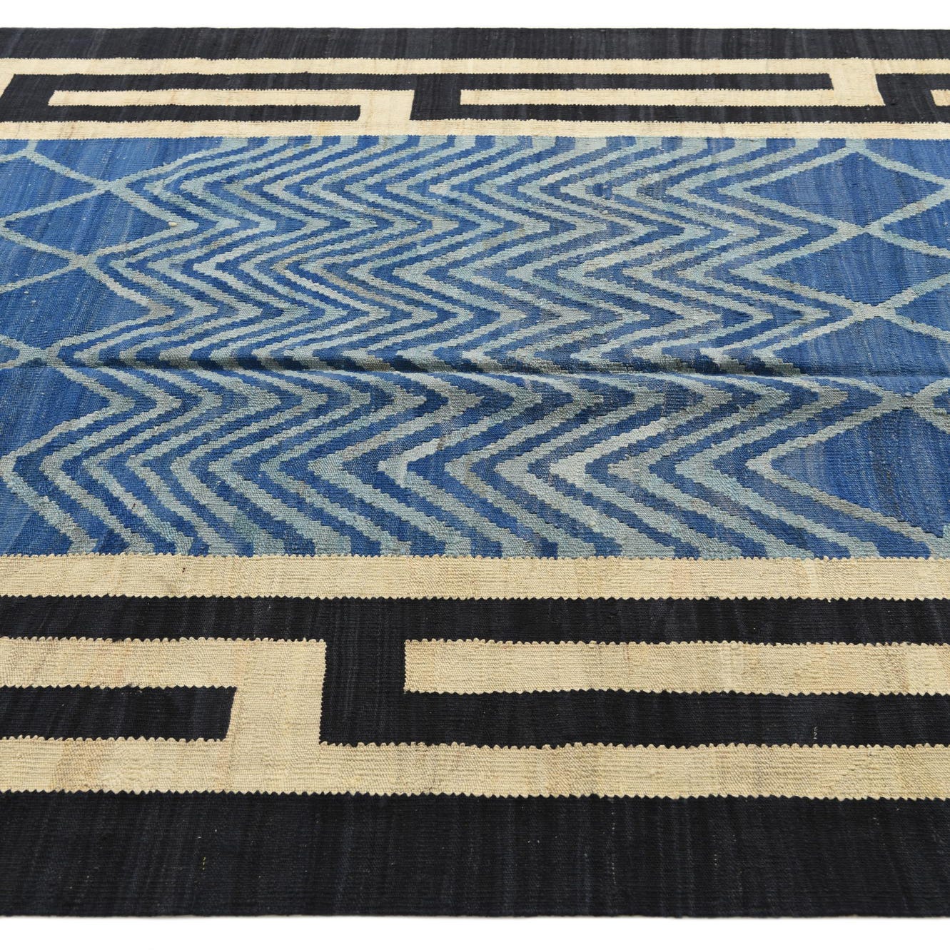 A 7x10 rectangular Kilim Modern wool rug featuring a central blue field with geometric patterns, flanked by black borders with a cream Greek key design.