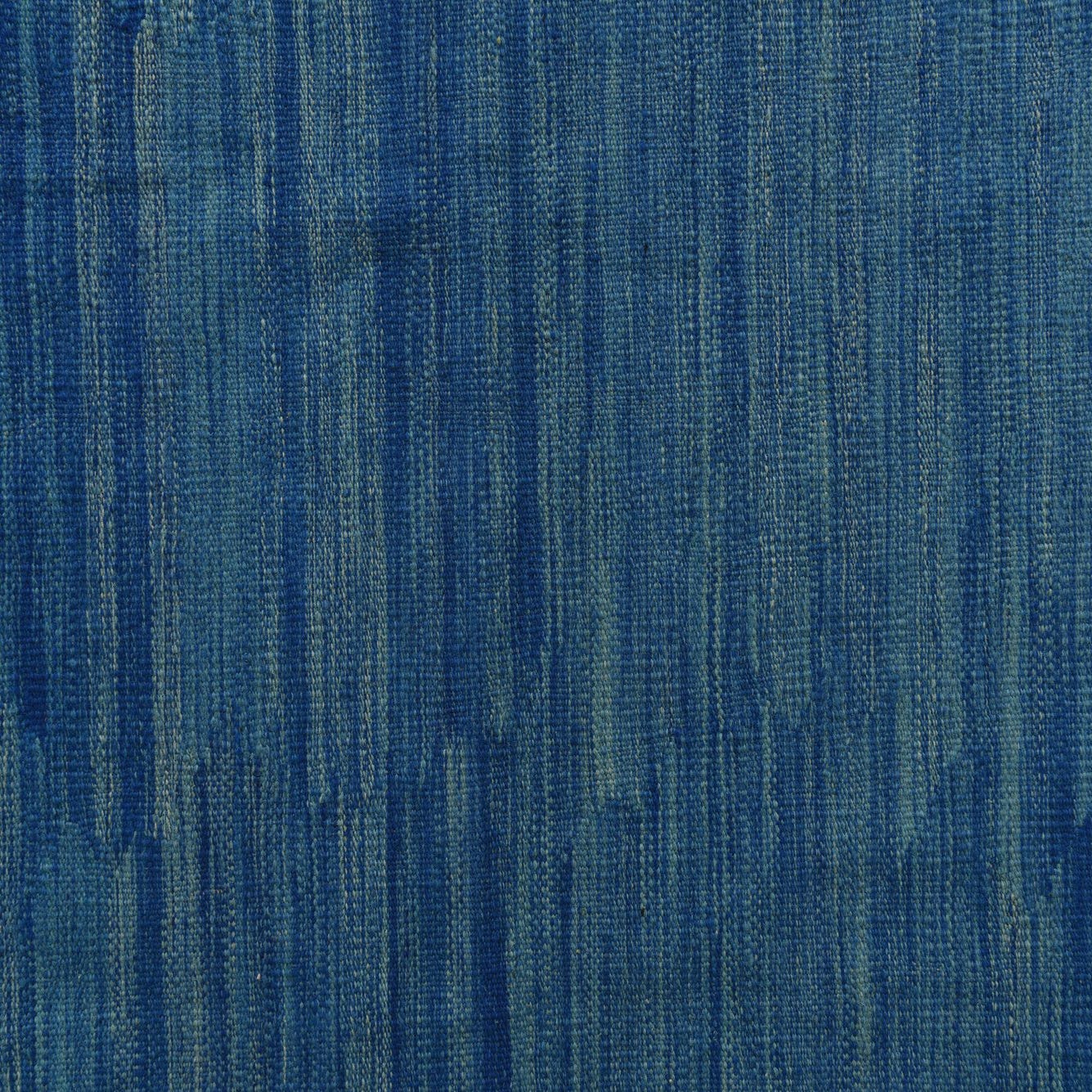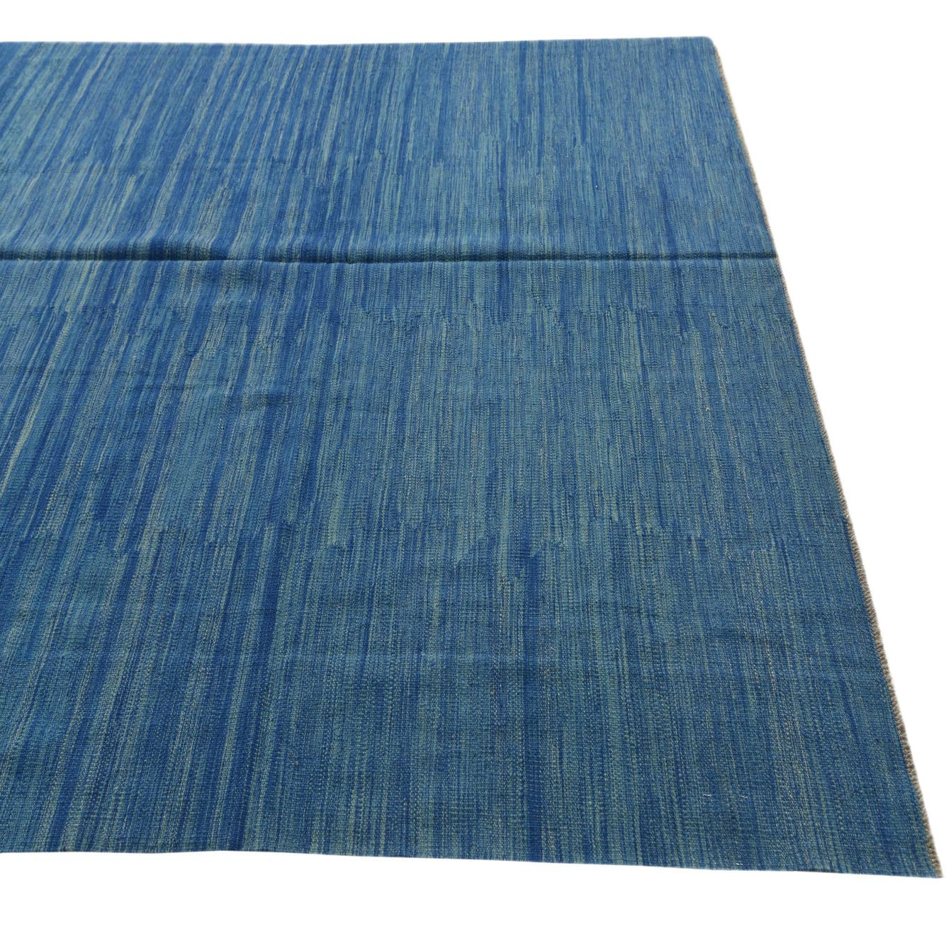 A 7x10 rectangular flatweave rug in varying shades of blue, featuring a subtle abstract tribal pattern.