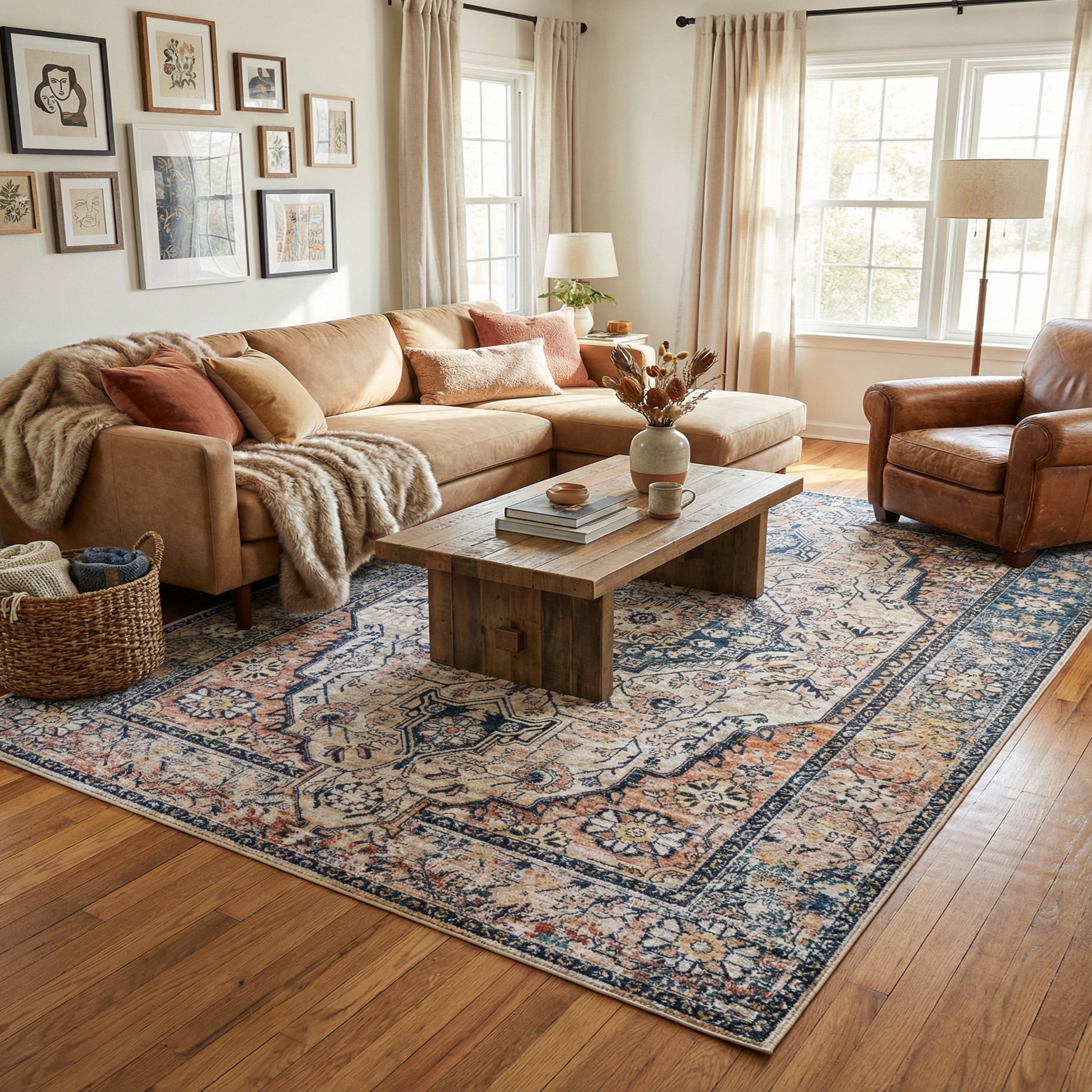 Machine-made polypropylene construction gives the surface a low, even pile that feels smooth and slightly cushioned underfoot. The texture is comfortable to touch without lifting or shifting under furniture, making it a practical choice for everyday rooms. Place it beneath a sofa and coffee table to ground a living area, under a dining table to define the dining space, or layered at the foot of a bed to introduce pattern and color to a bedroom or home office. It pairs well with warm woods, neutral upholstery, and mid-century or transitional furnishings.