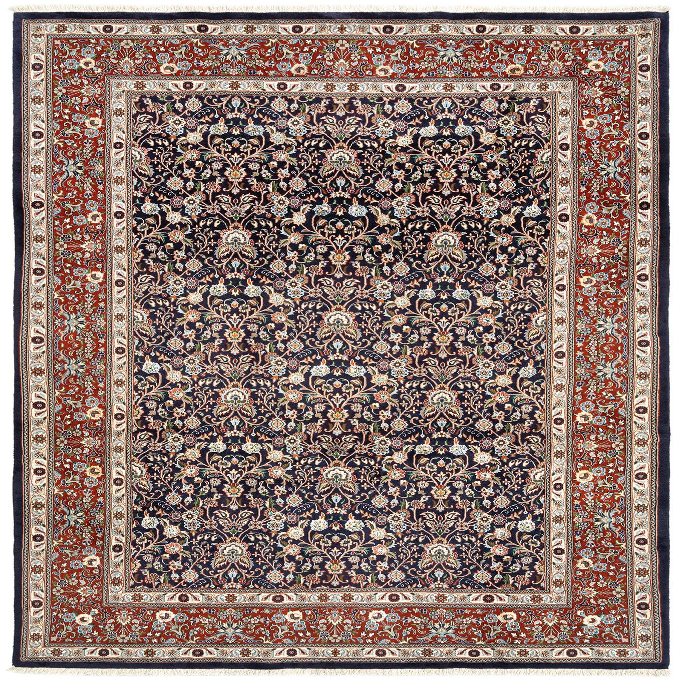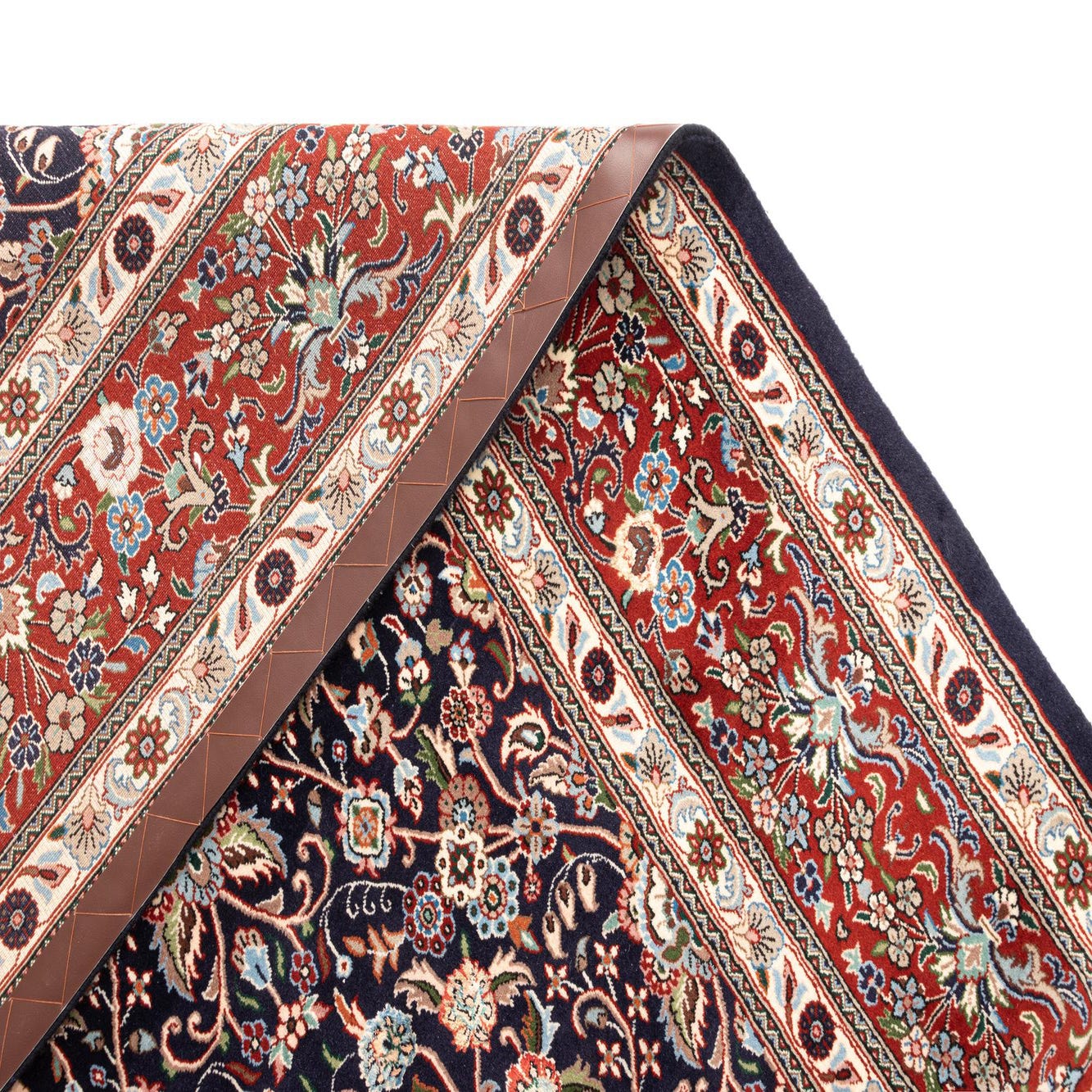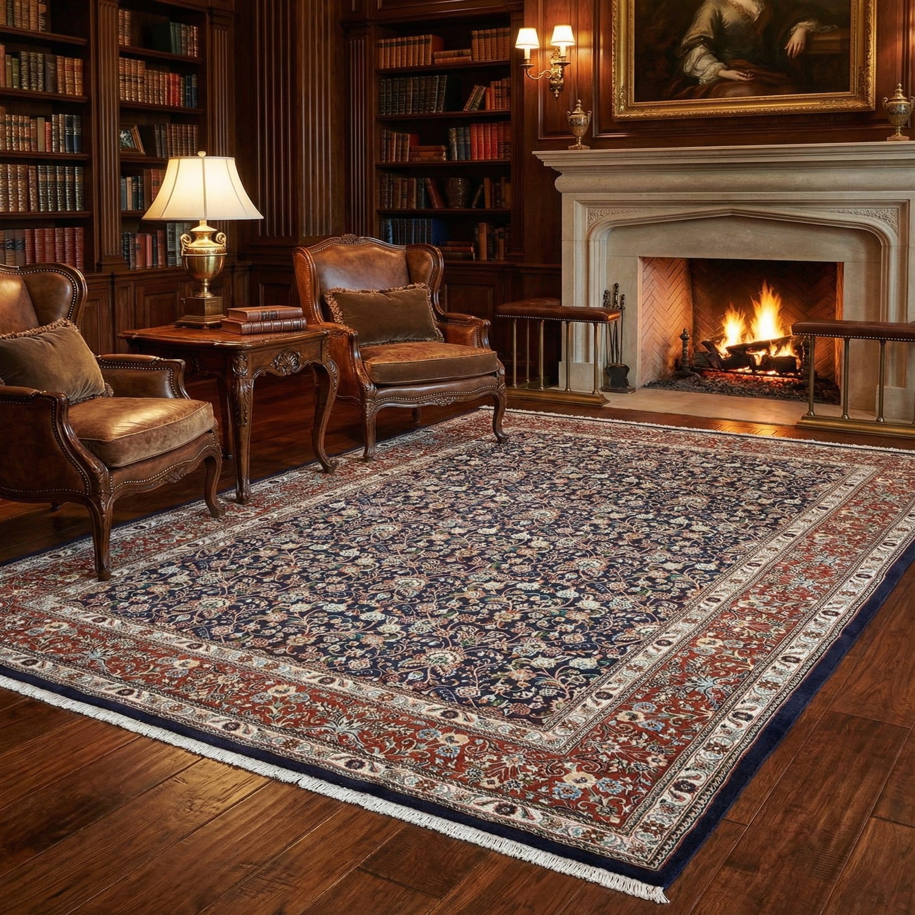 A 7x10 rectangular Mood collection Persian rug with a deep blue field and intricate floral patterns, bordered by rich red and cream accents.