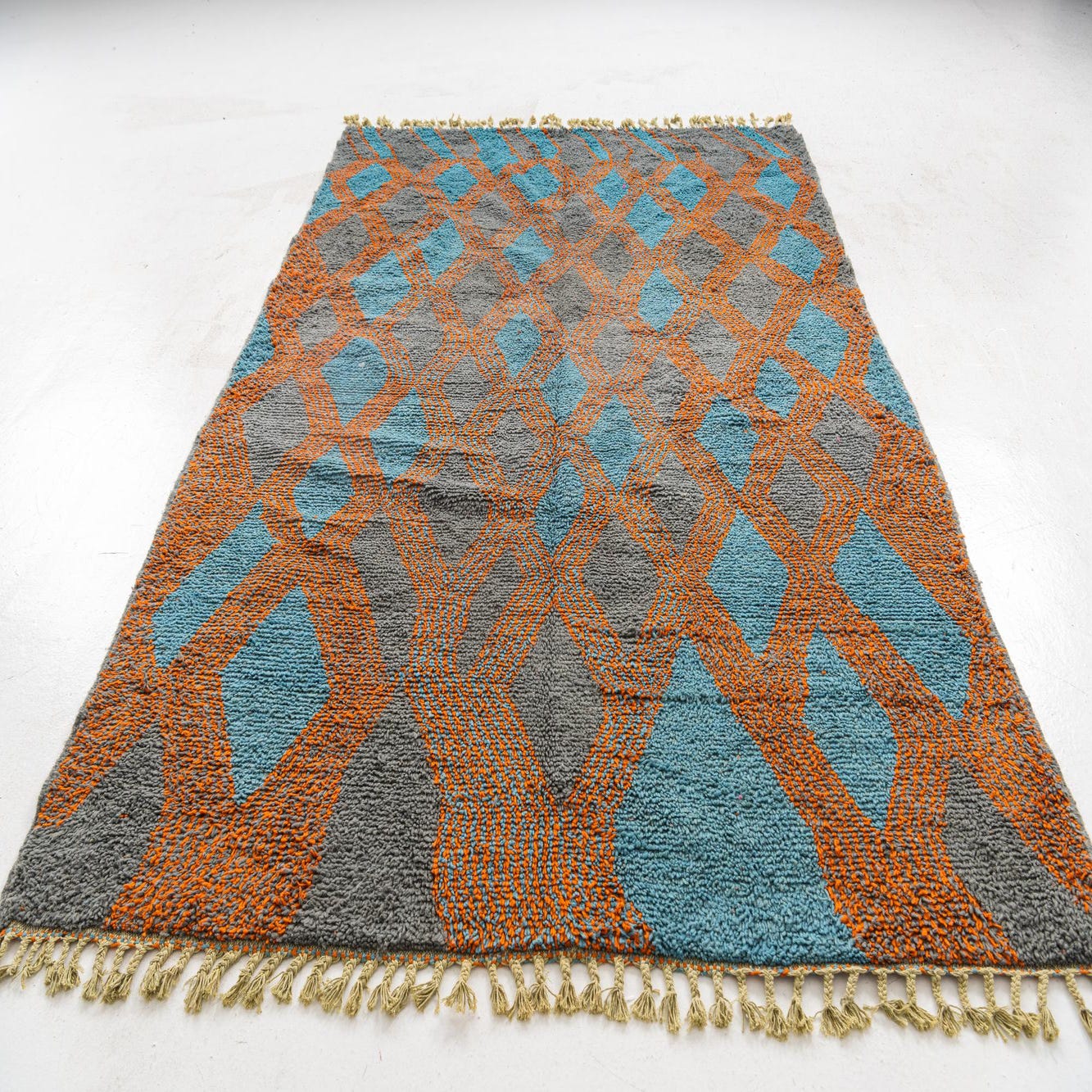 A 7x10 rectangular Moroccan shag rug featuring a tribal diamond pattern in blue and orange on a gray background, with fringed edges.