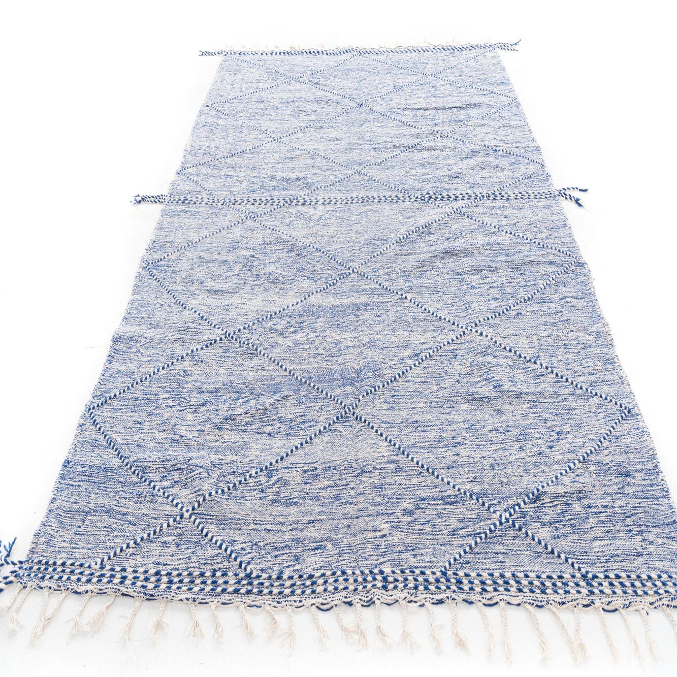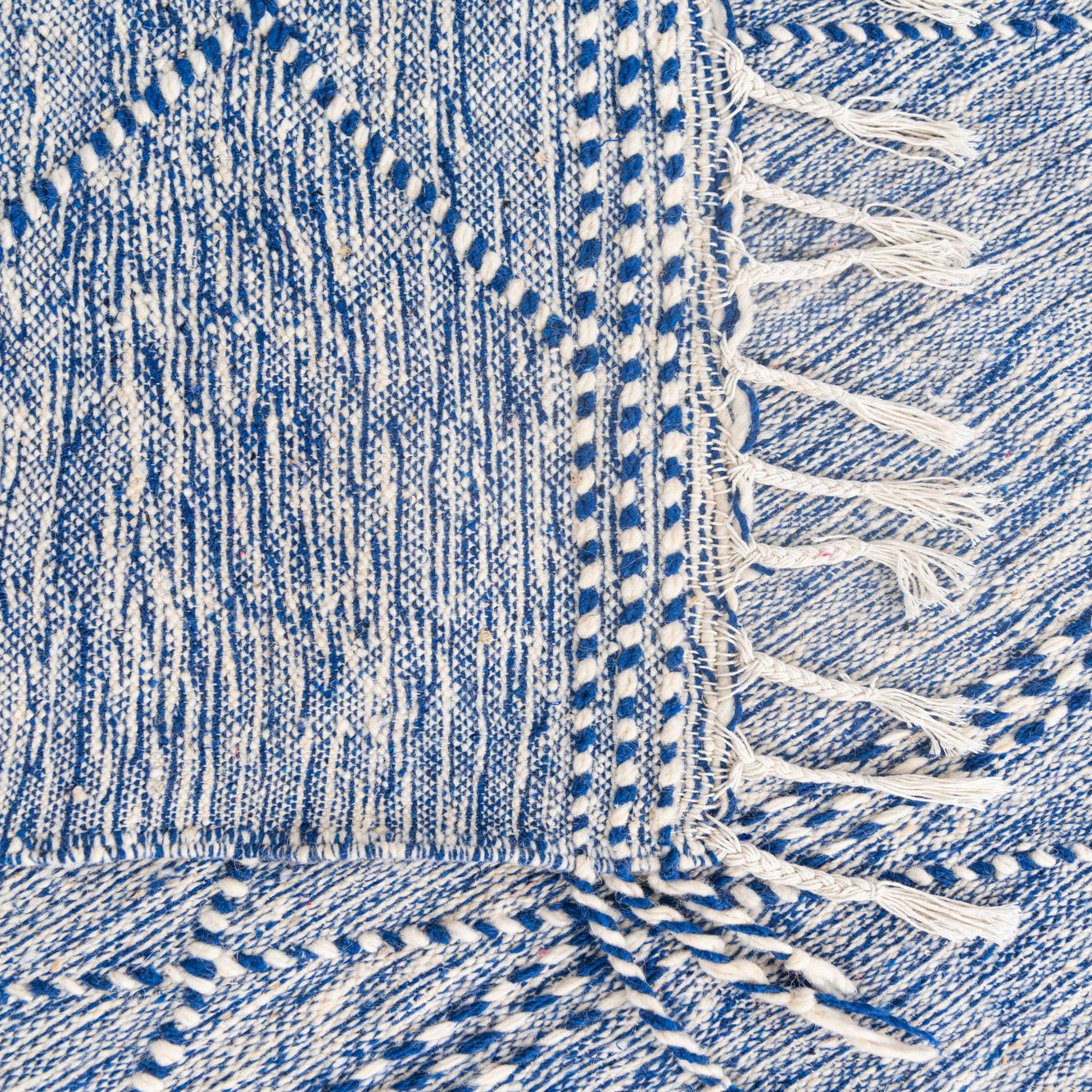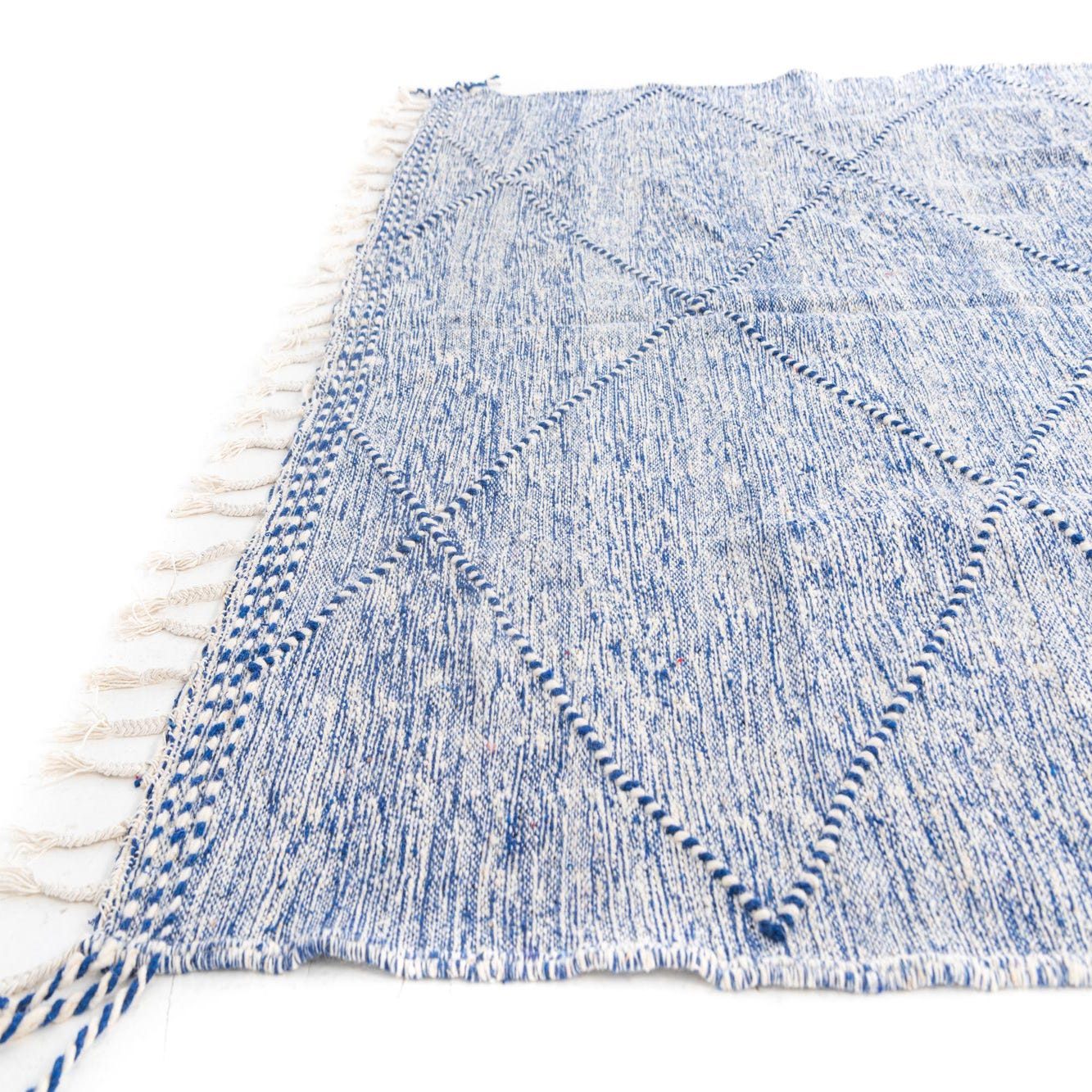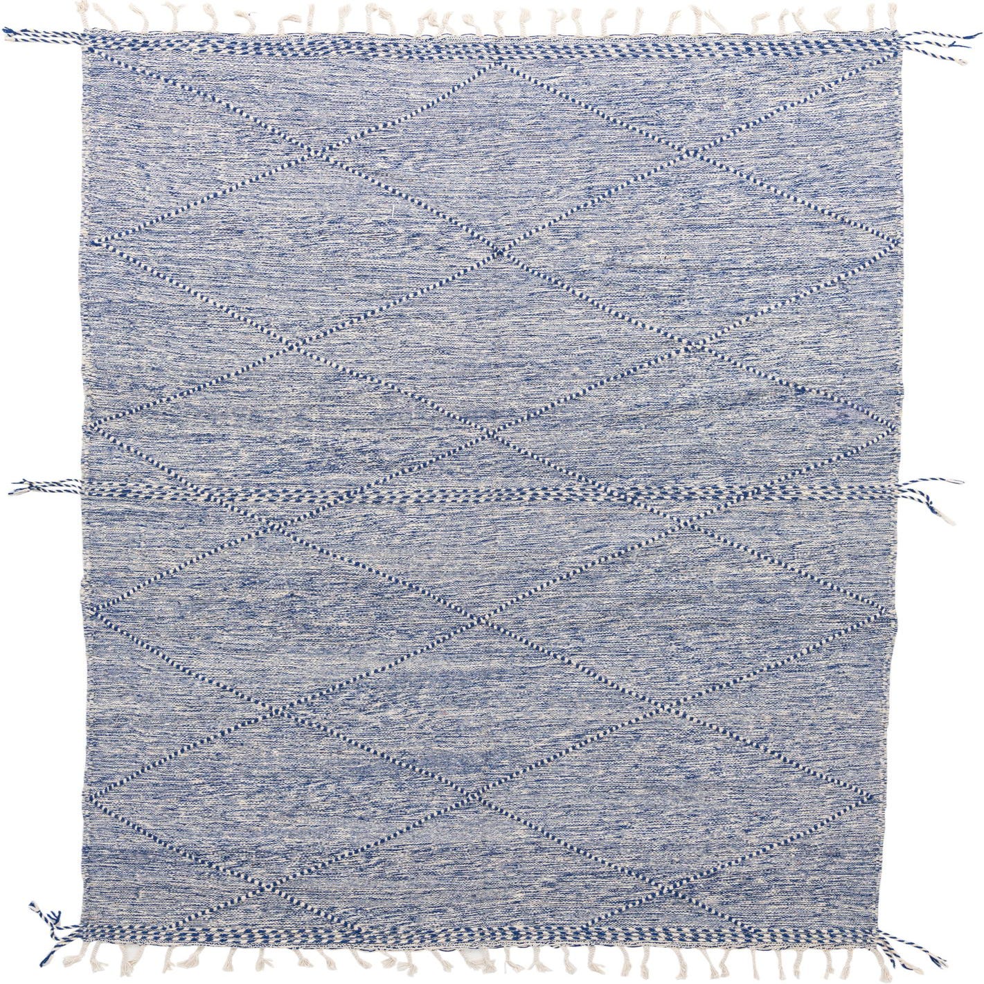 A 7x10 rectangular blue wool shag rug with a modern tribal diamond pattern and fringe.