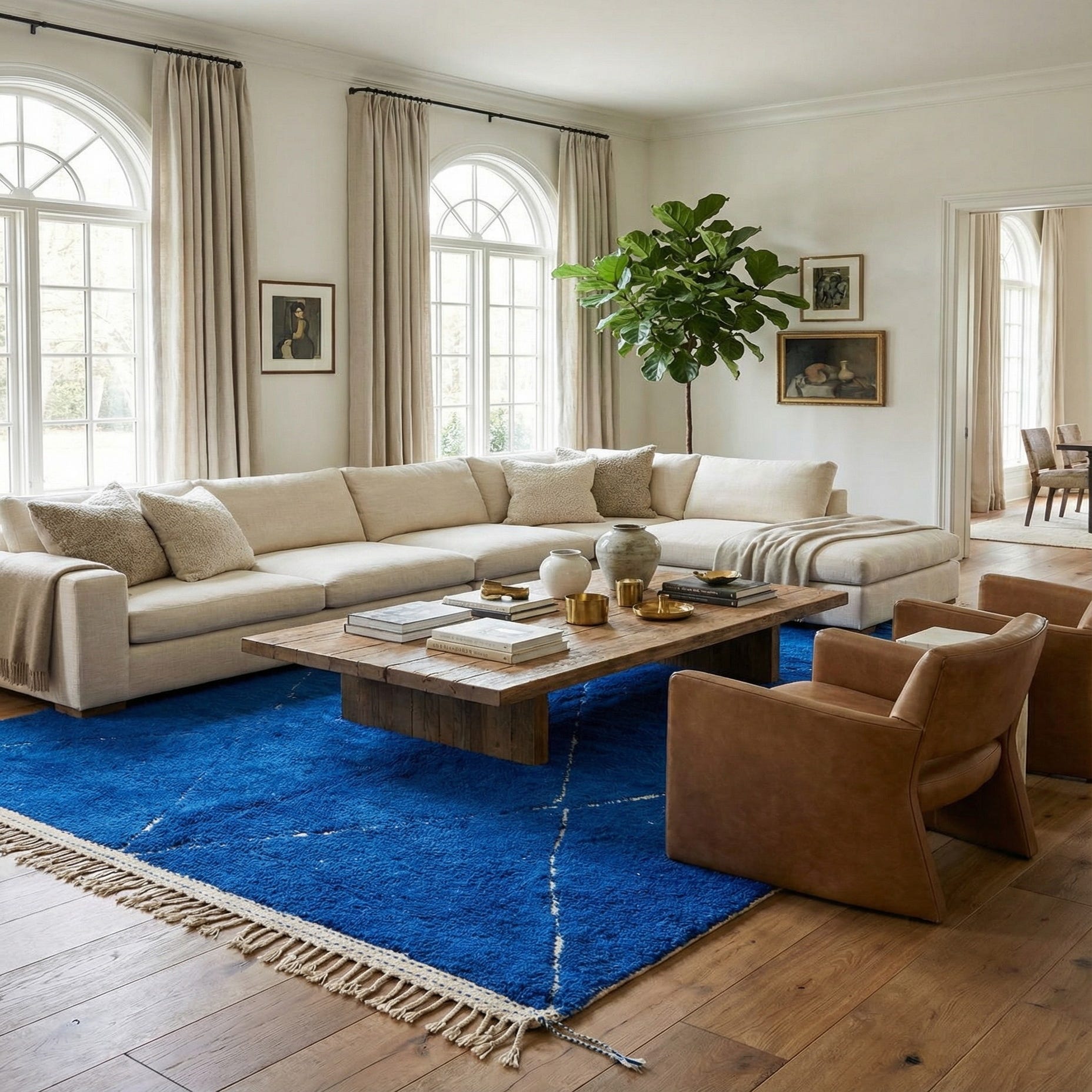 The fringe detailing at the ends of the rug adds an additional element of traditional charm. When styling this piece, consider allowing it to be a standout element in a minimalist space or pairing it with complementary warm tones and wood finishes for a more layered, textured look.
