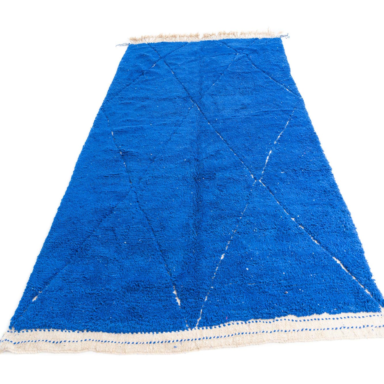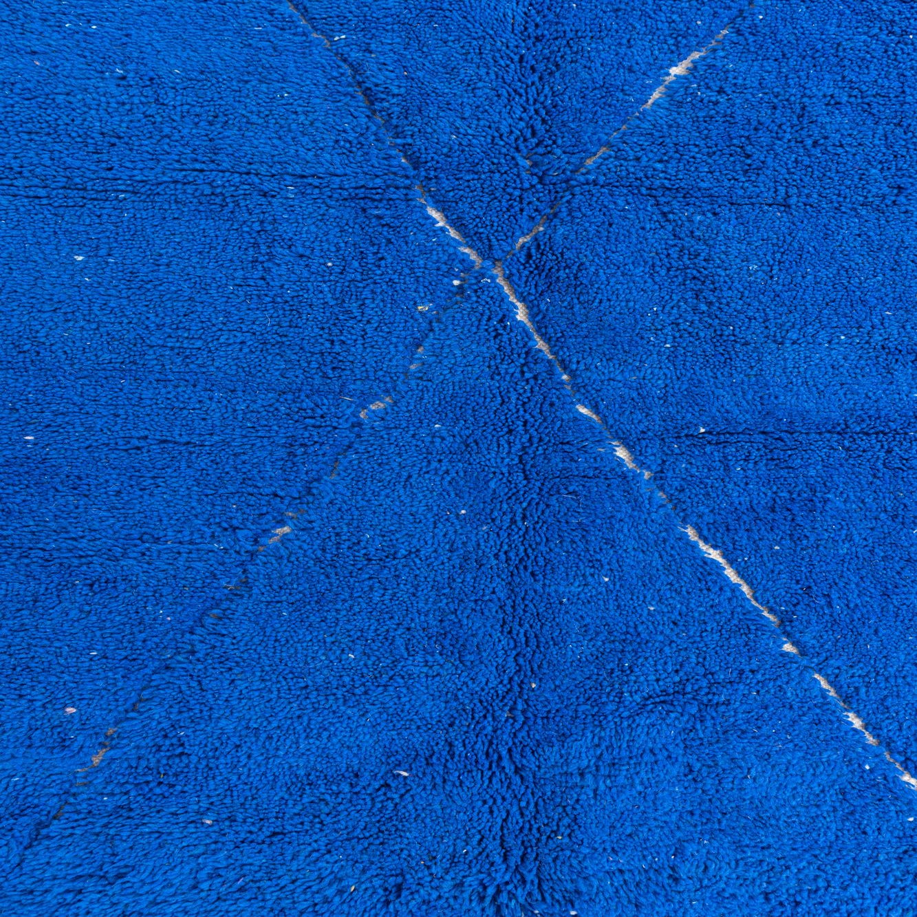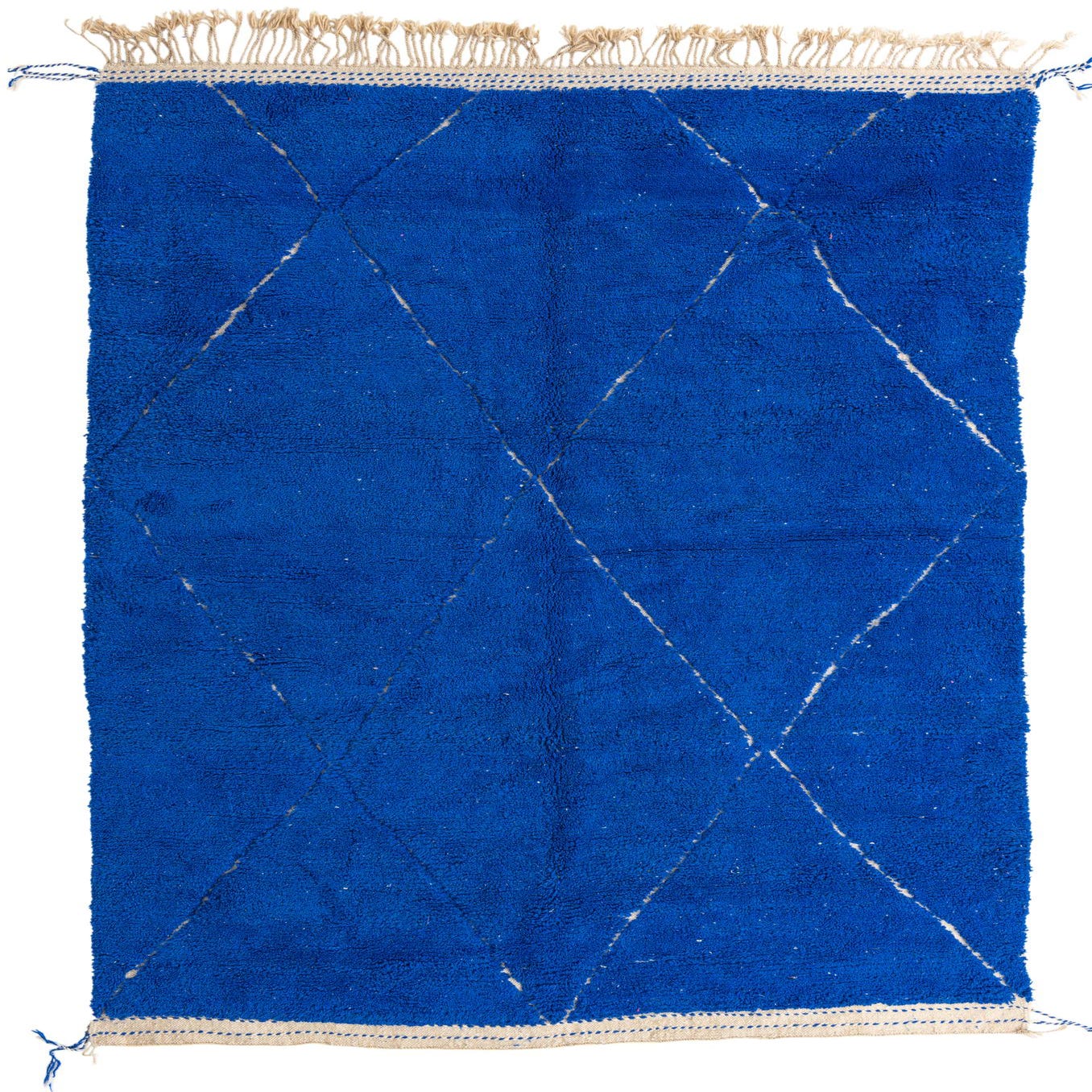 This Moroccan collection rug presents a simplistic yet captivating design, featuring a bold blue background with contrasting ivory geometric patterns. Hand-knotted from 100% wool, this 7x10 rug balances traditional craftsmanship with a modern aesthetic. Its deep blue hue lends a strong visual anchor to any room, while the handcrafted ivory lines add a layer of textural intrigue.