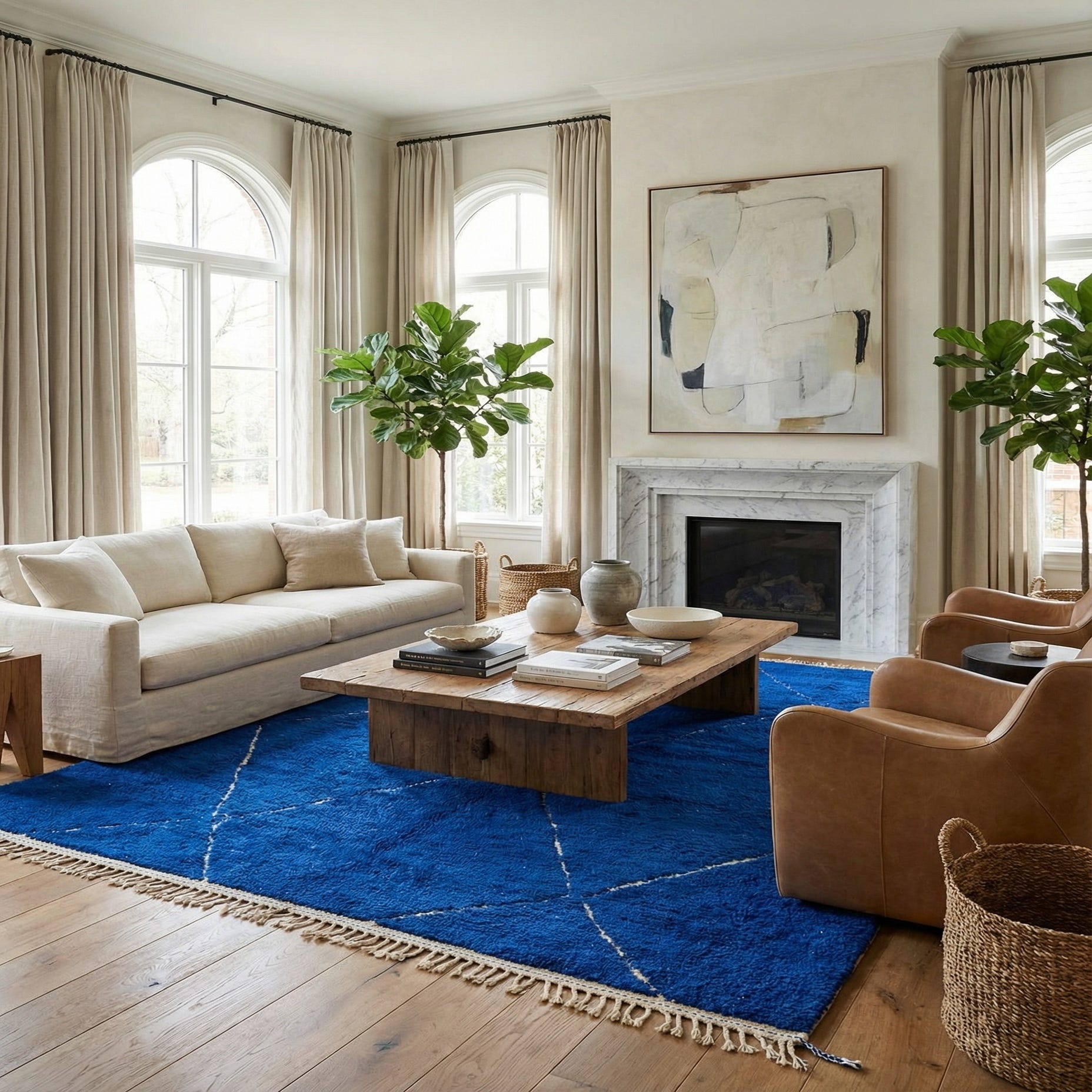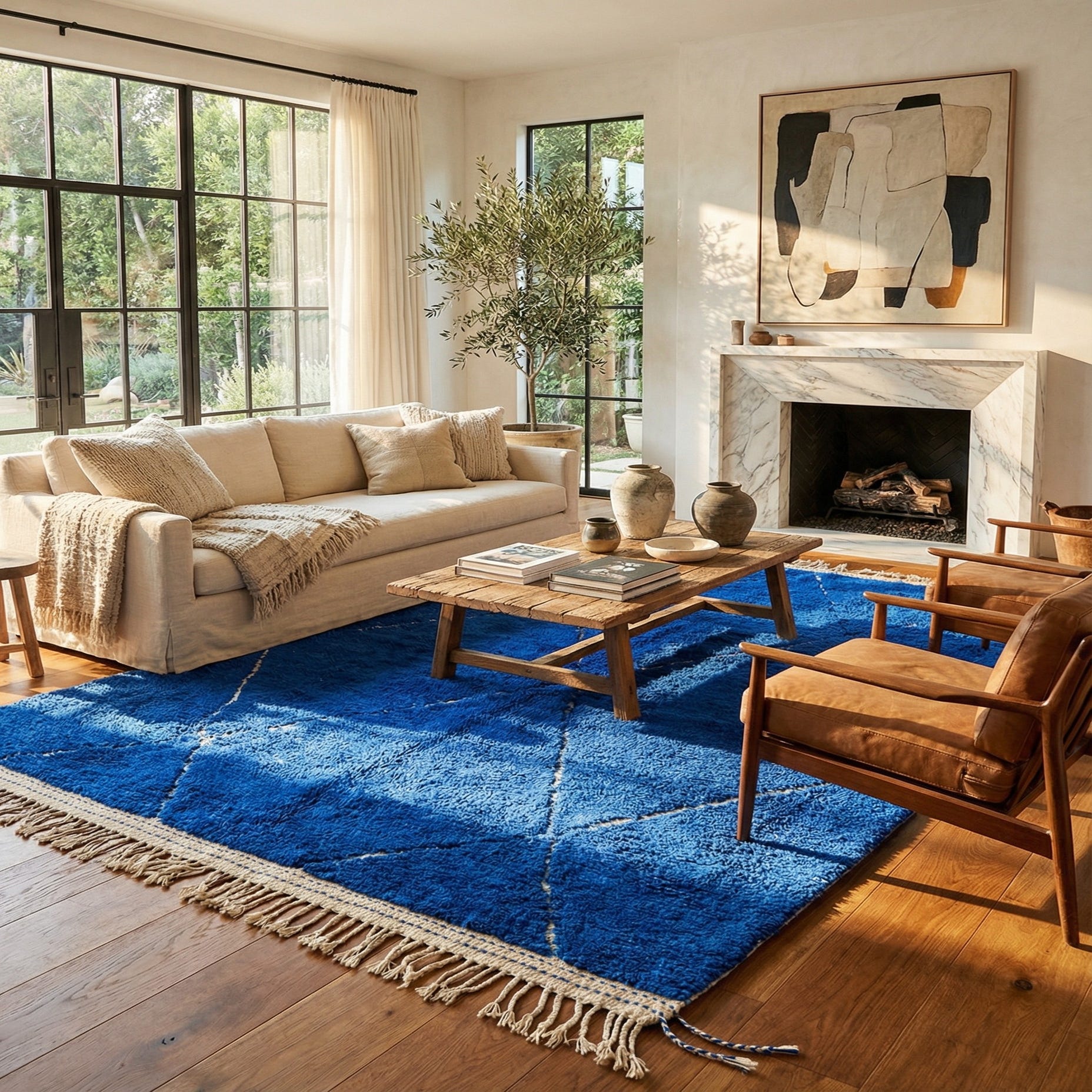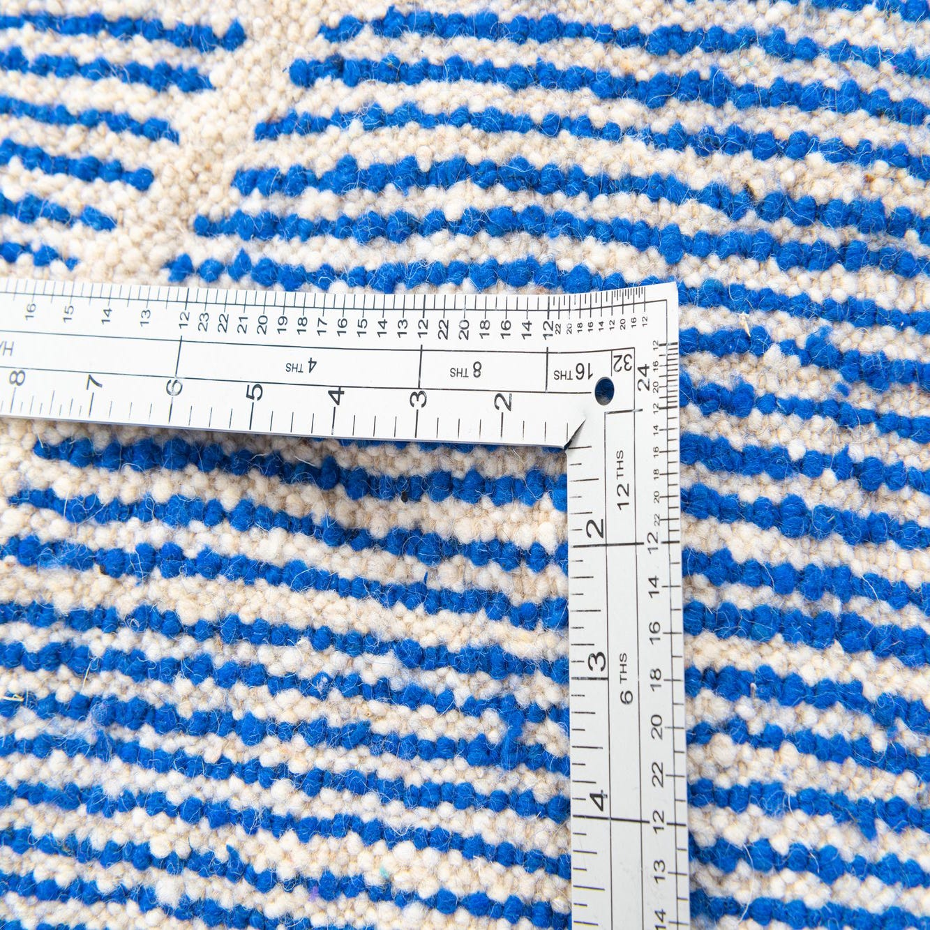 This Moroccan collection rug presents a simplistic yet captivating design, featuring a bold blue background with contrasting ivory geometric patterns. Hand-knotted from 100% wool, this 7x10 rug balances traditional craftsmanship with a modern aesthetic. Its deep blue hue lends a strong visual anchor to any room, while the handcrafted ivory lines add a layer of textural intrigue.