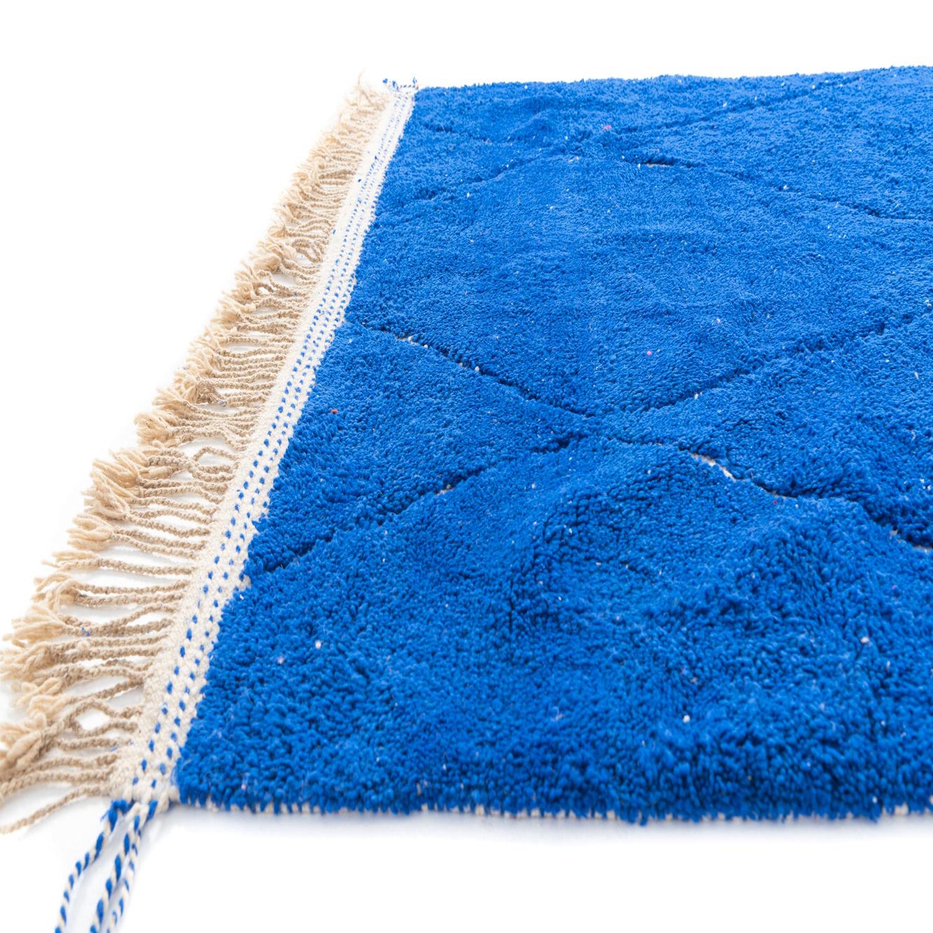 A 7x10 rectangular blue shag rug with a white tribal diamond pattern and fringe, suitable for a living room.