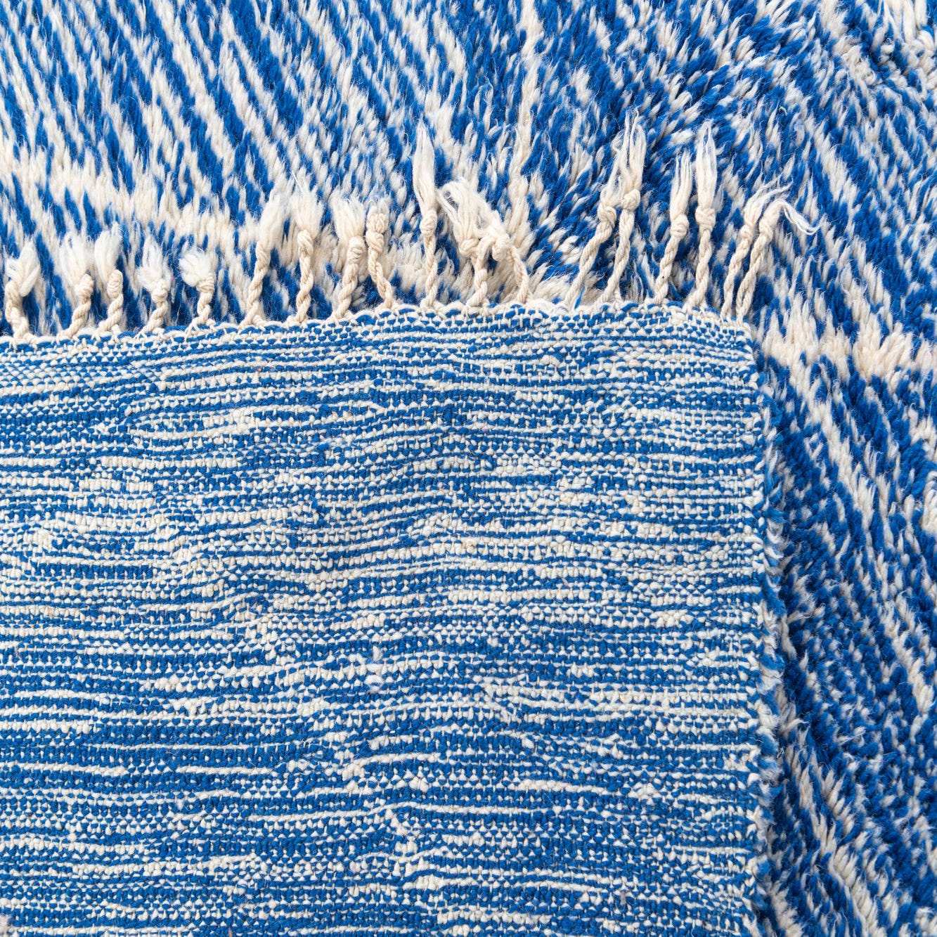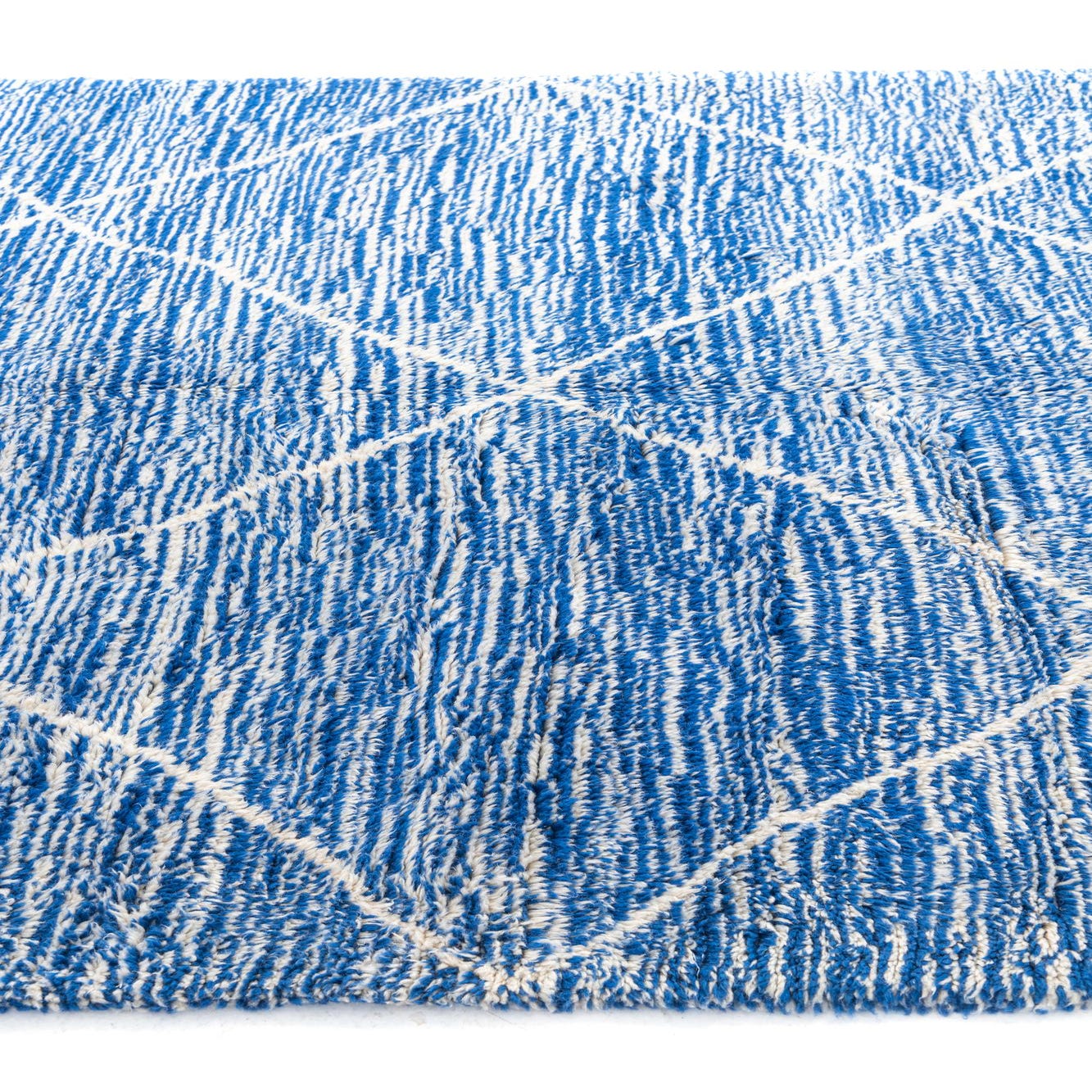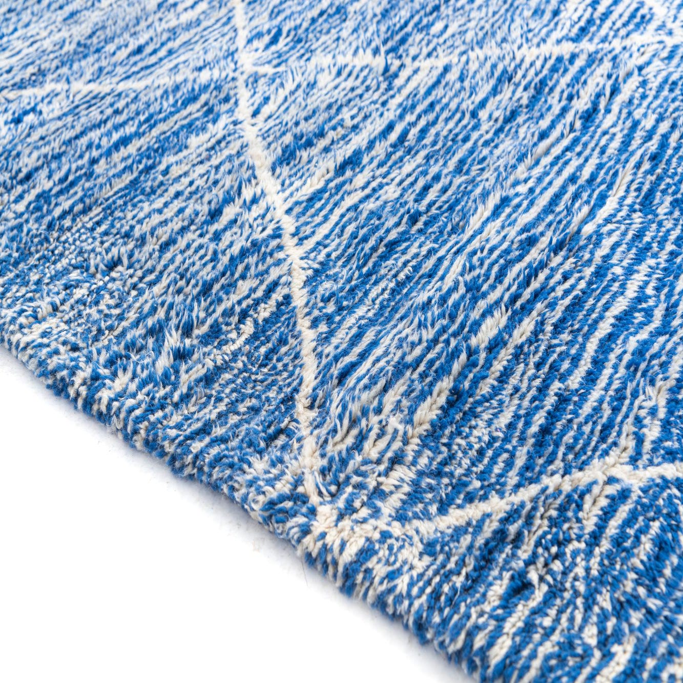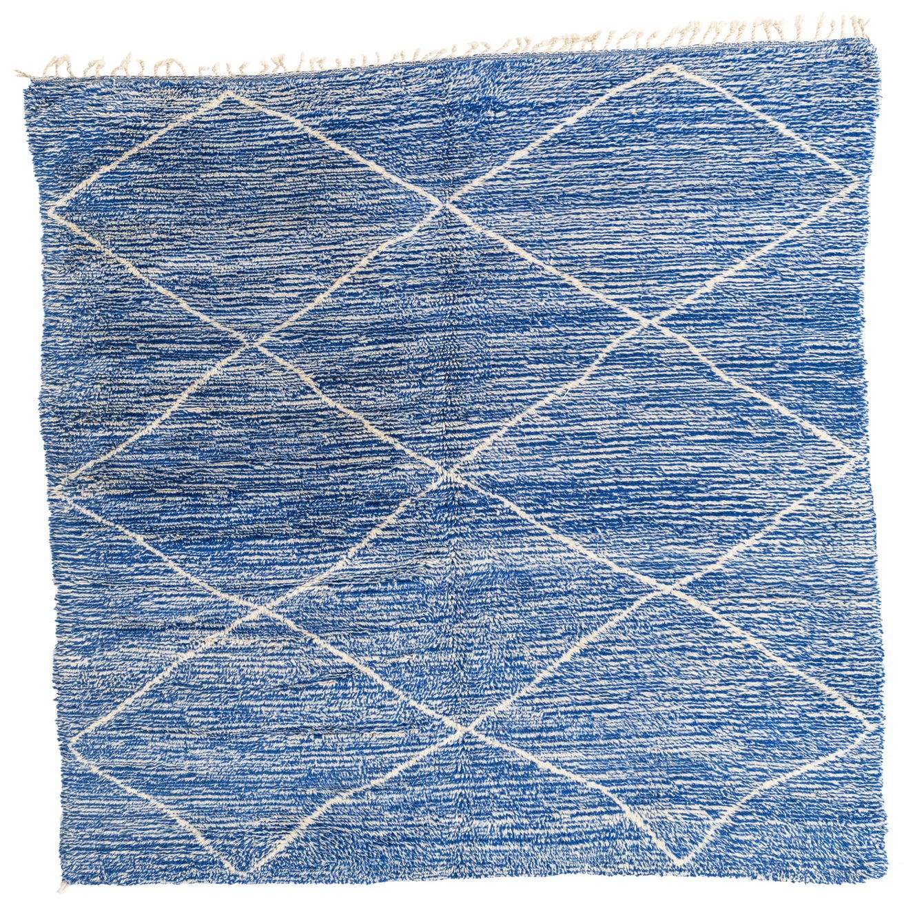 A 7x10 rectangular Moroccan shag rug in vibrant blue with a white tribal diamond pattern and fringed edges.