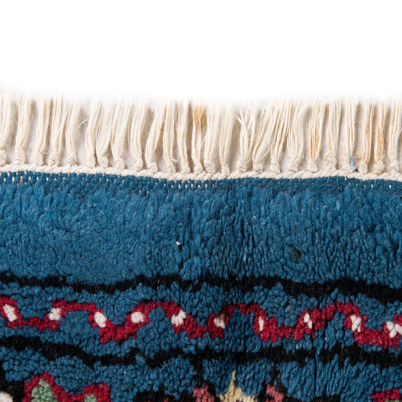 A 7x10 rectangular blue Moroccan wool rug with traditional tribal patterns in red, black, and white.