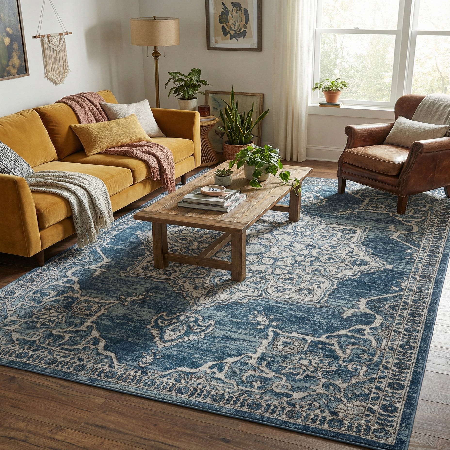 Machine-made from 100% polypropylene, the rug has a low, dense pile that feels smooth underfoot and holds the pattern with clear definition. Its cool blue field and neutral ivory and gray accents make it easy to pair with a navy sofa or light linens, and it works well anchoring a living room seating area, grounding a dining table, or layering under a bed in a bedroom. The mix of traditional motifs and timeworn texture fits transitional, coastal, and classic interiors looking for a calm, collected anchor.