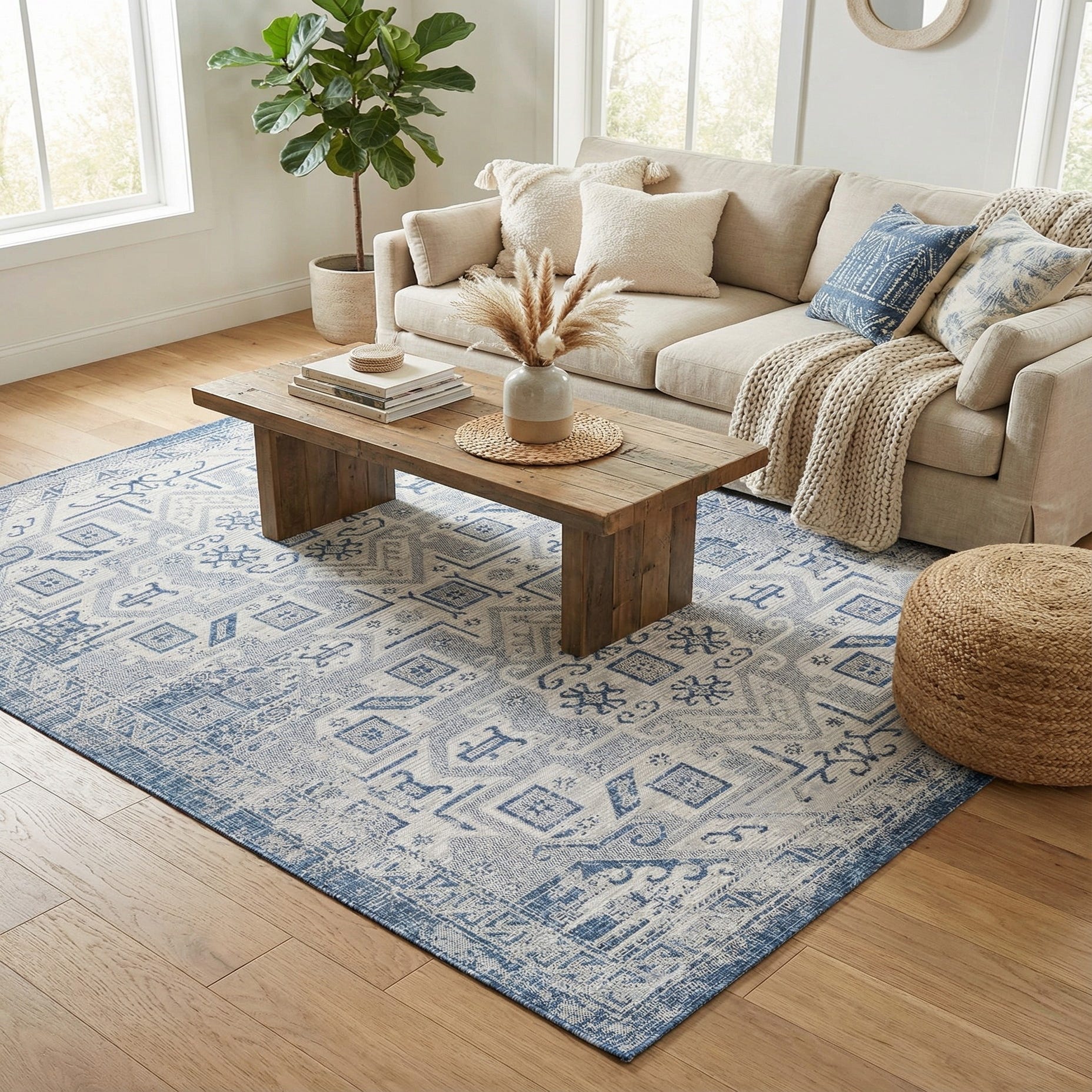 A 7x10 rectangular blue and white Southwestern rug with a distressed tribal pattern, suitable for indoor or outdoor use.
