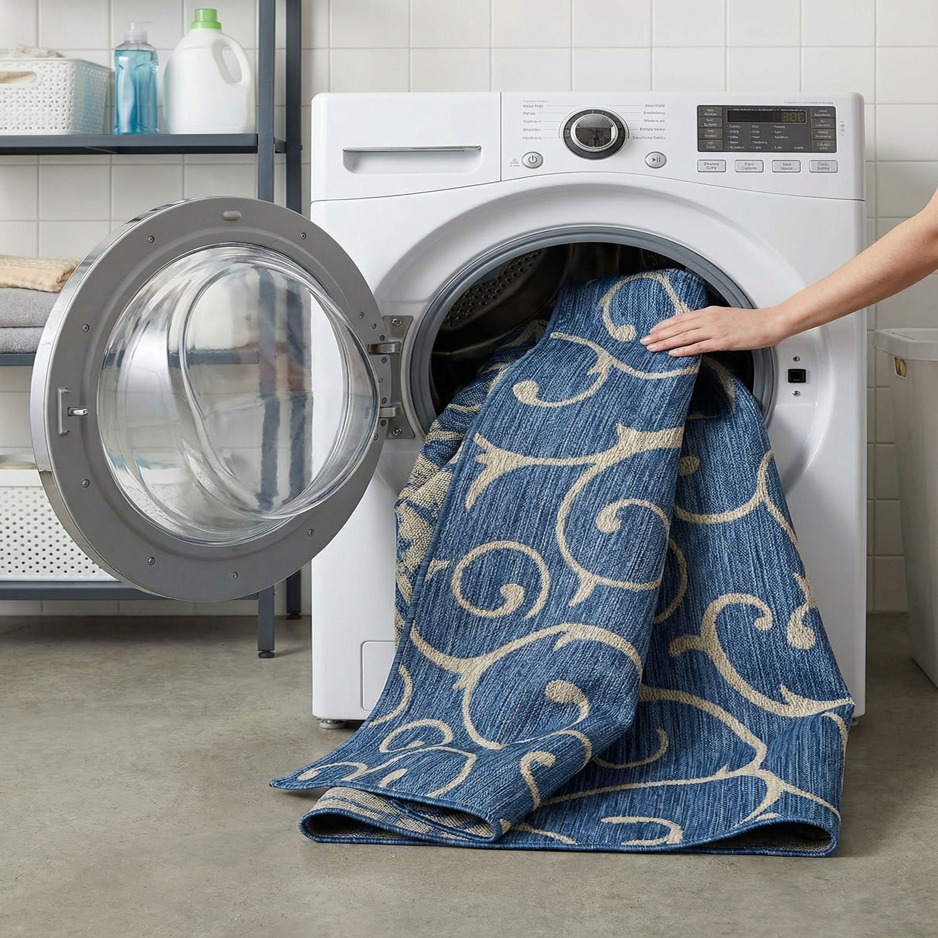 This rug works well on covered patios, sunrooms, and casual dining areas, or inside as an anchor for coastal, nautical, or modern farmhouse schemes. Pair it with weathered wood or wicker furniture, neutral gray upholstery, and crisp white accents to emphasize the blue-and-gray palette, or layer it under a dining table or conversational seating group to bring pattern and cohesion to an outdoor living space.