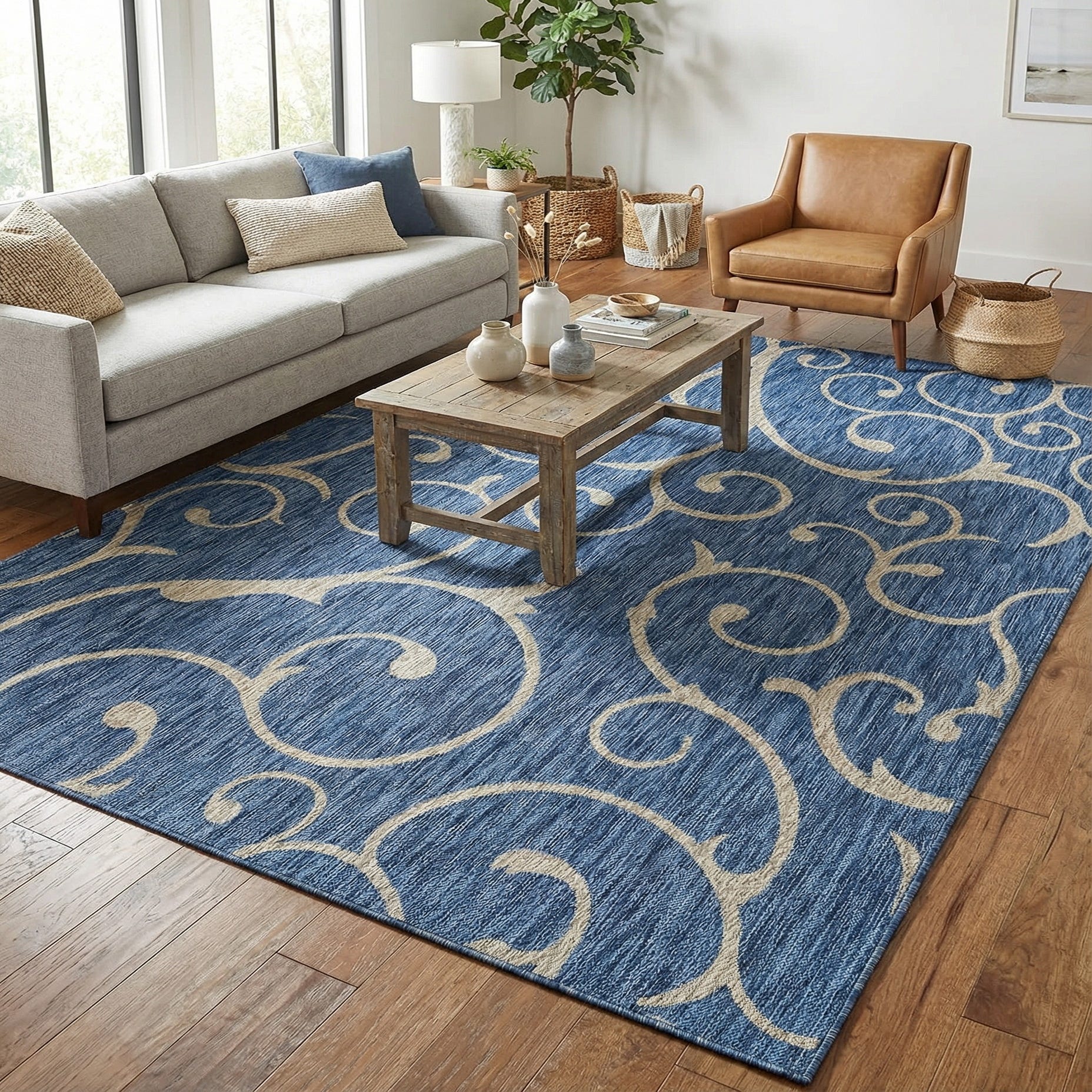 A 7x10 rectangular blue indoor/outdoor rug with an elegant cream botanical scroll pattern, suitable for a patio or living room.