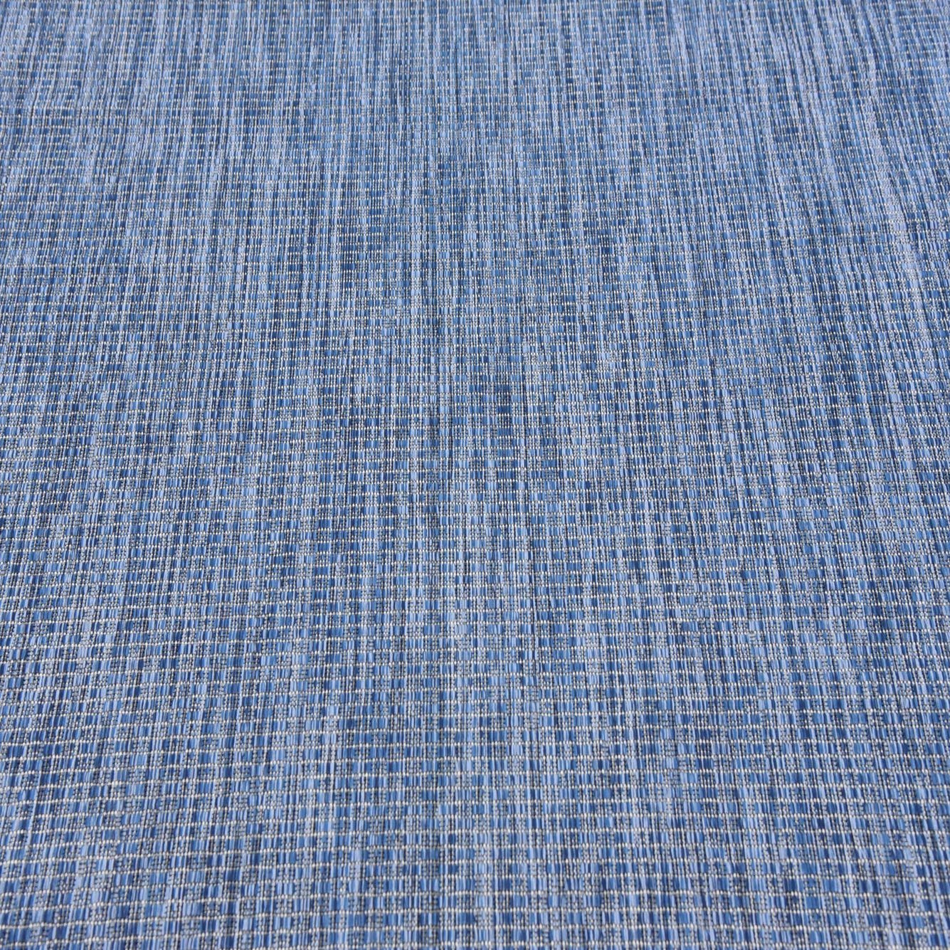Machine-made from 100% polypropylene, this rug presents a calm blue field threaded with lighter blue fibers that create a refined, linen-like crosshatch. The closely woven, low-profile surface feels smooth underfoot with a subtle nubby texture visible up close—an understated linear pattern that reads as a solid from across the room while offering visual depth and movement.