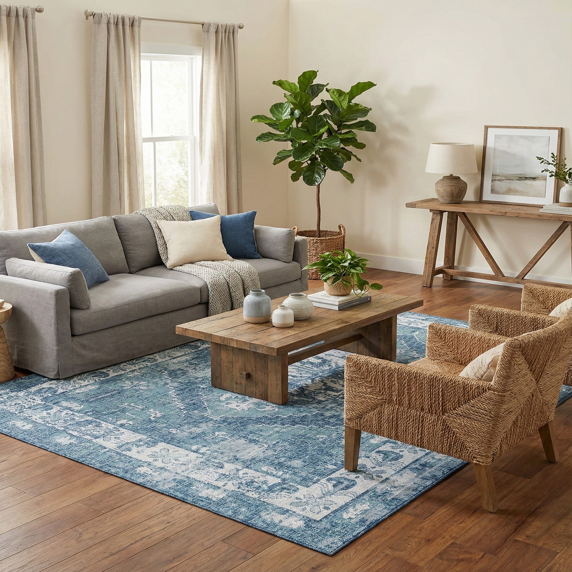 Primary color is Blue. Colors in this rug include: Blue, Gray, Ivory, Light Blue.