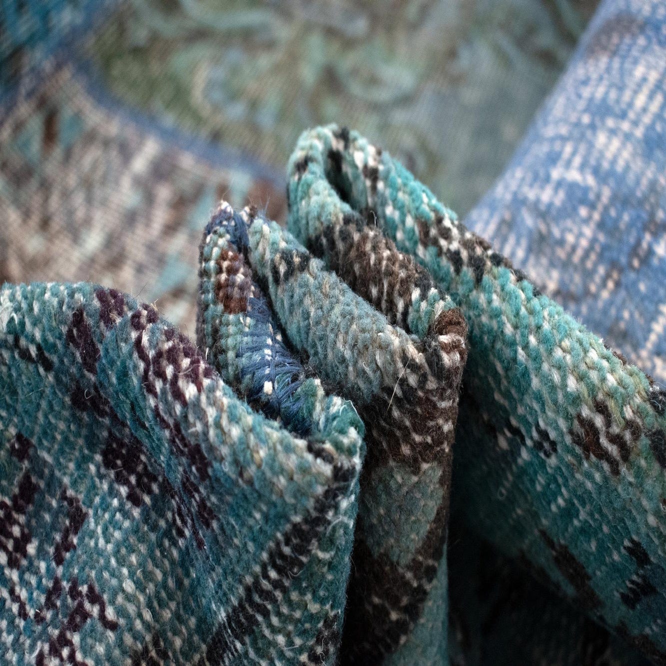 A 7x10 rectangular patchwork rug featuring various shades of blue and teal, with distressed Persian patterns.