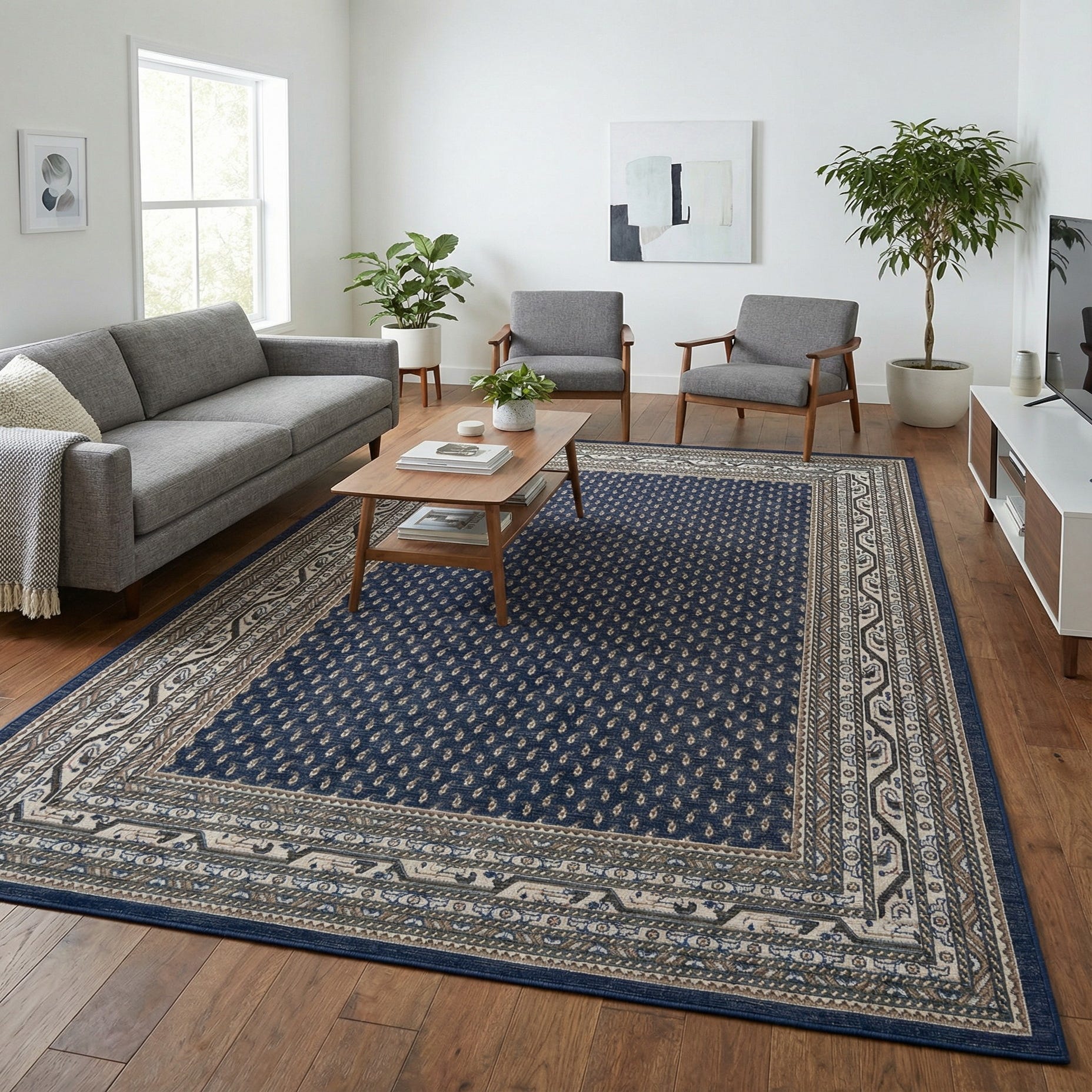 This rug fits well in traditional and transitional rooms where pattern and color provide a grounding element—place it under a sofa and coffee table to anchor a living room, beneath a dining set to add formality, or in a home office to introduce classic detail. It pairs naturally with navy or gray upholstery, warm wood tones and brass or matte black accents, and also layers nicely over hardwood or neutral flatweave for added visual depth.
