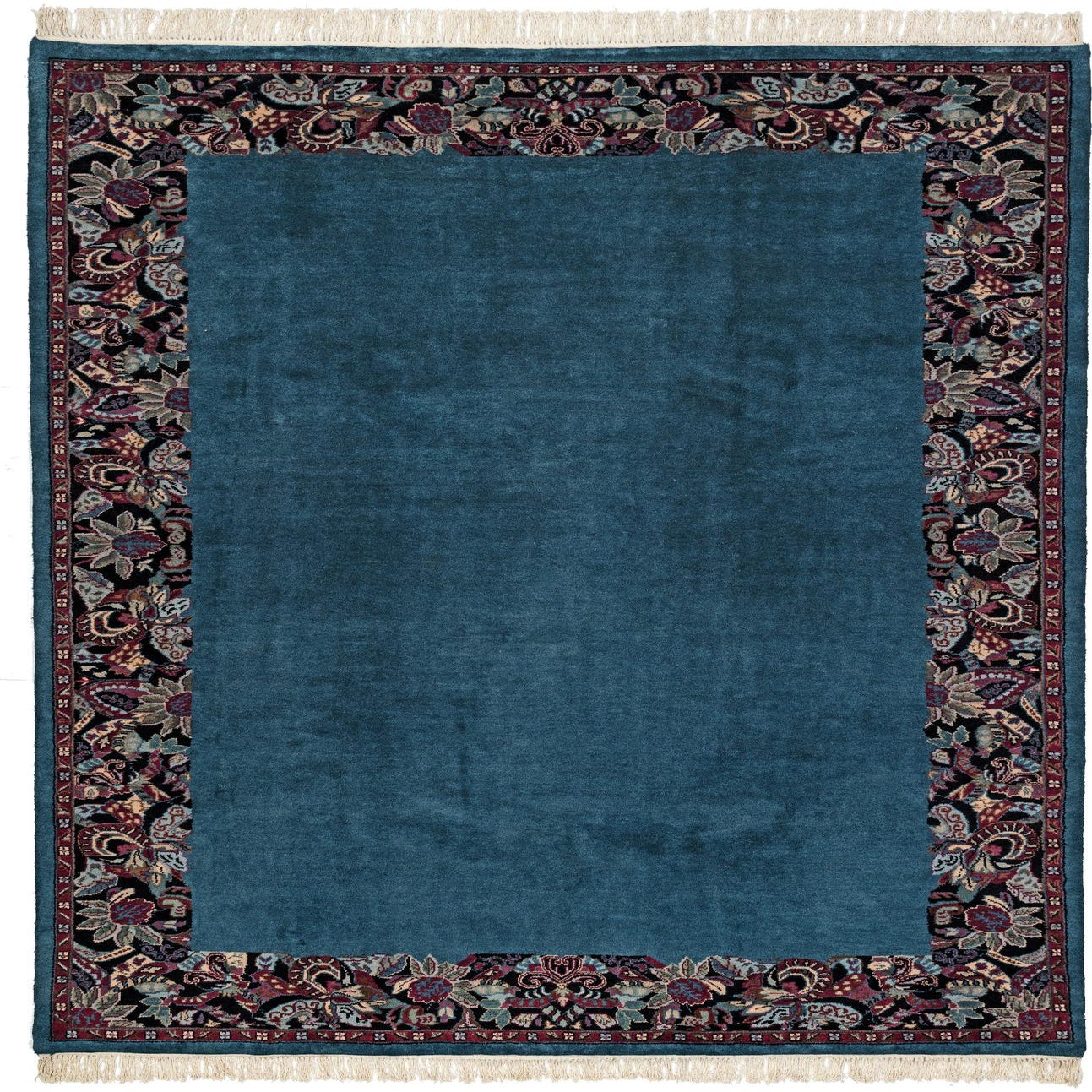 A 7x10 rectangular blue wool rug with a dark, ornate floral border, suitable for a living room.