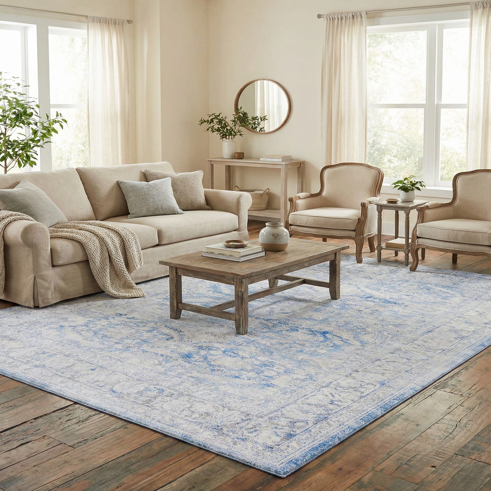Primary color is Blue. Colors in this rug include: Blue, Ivory, Gray.