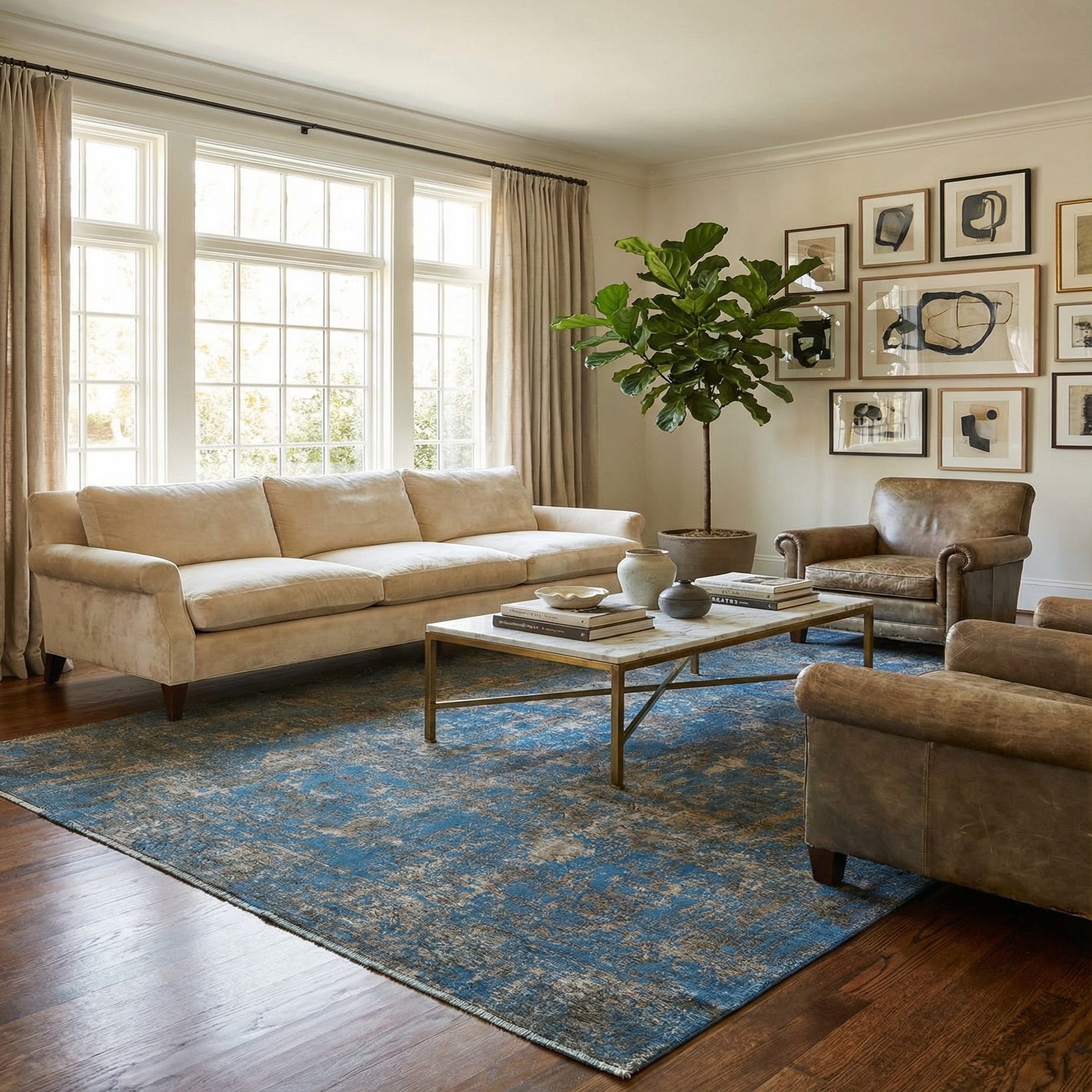 A 7x10 rectangular blue and brown distressed Persian-style wool rug with a vintage, modern pattern.