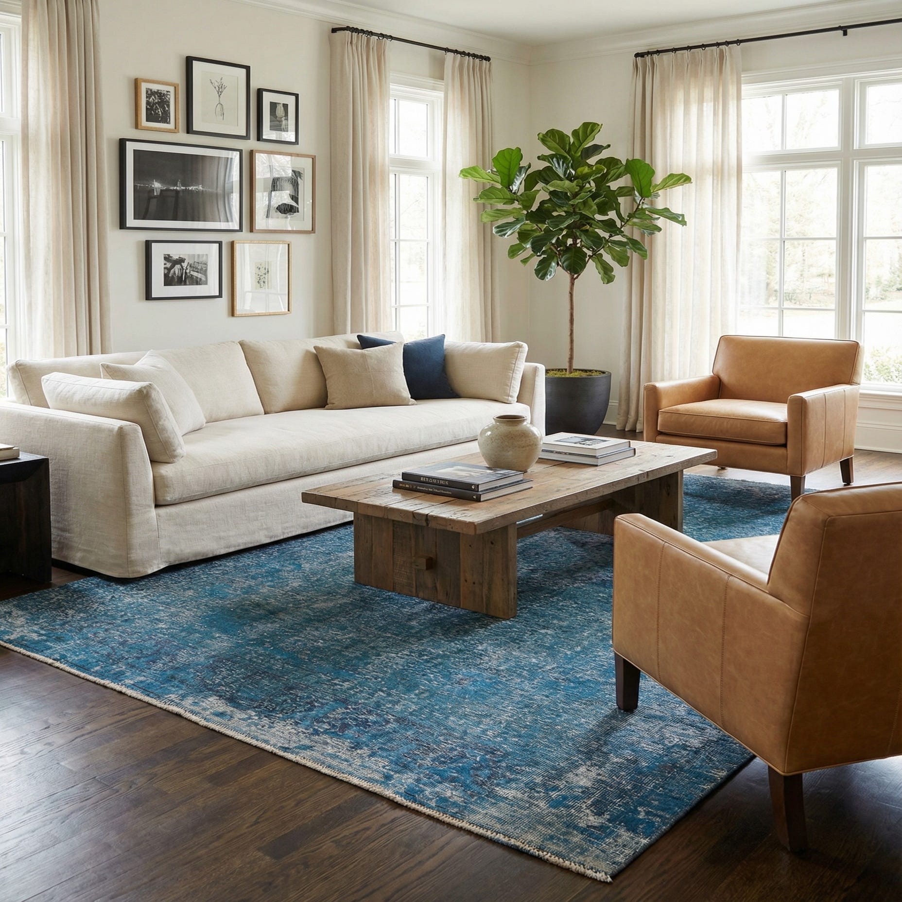 A 7x10 rectangular blue Persian-style rug with a distressed vintage medallion pattern, suitable for a living room.