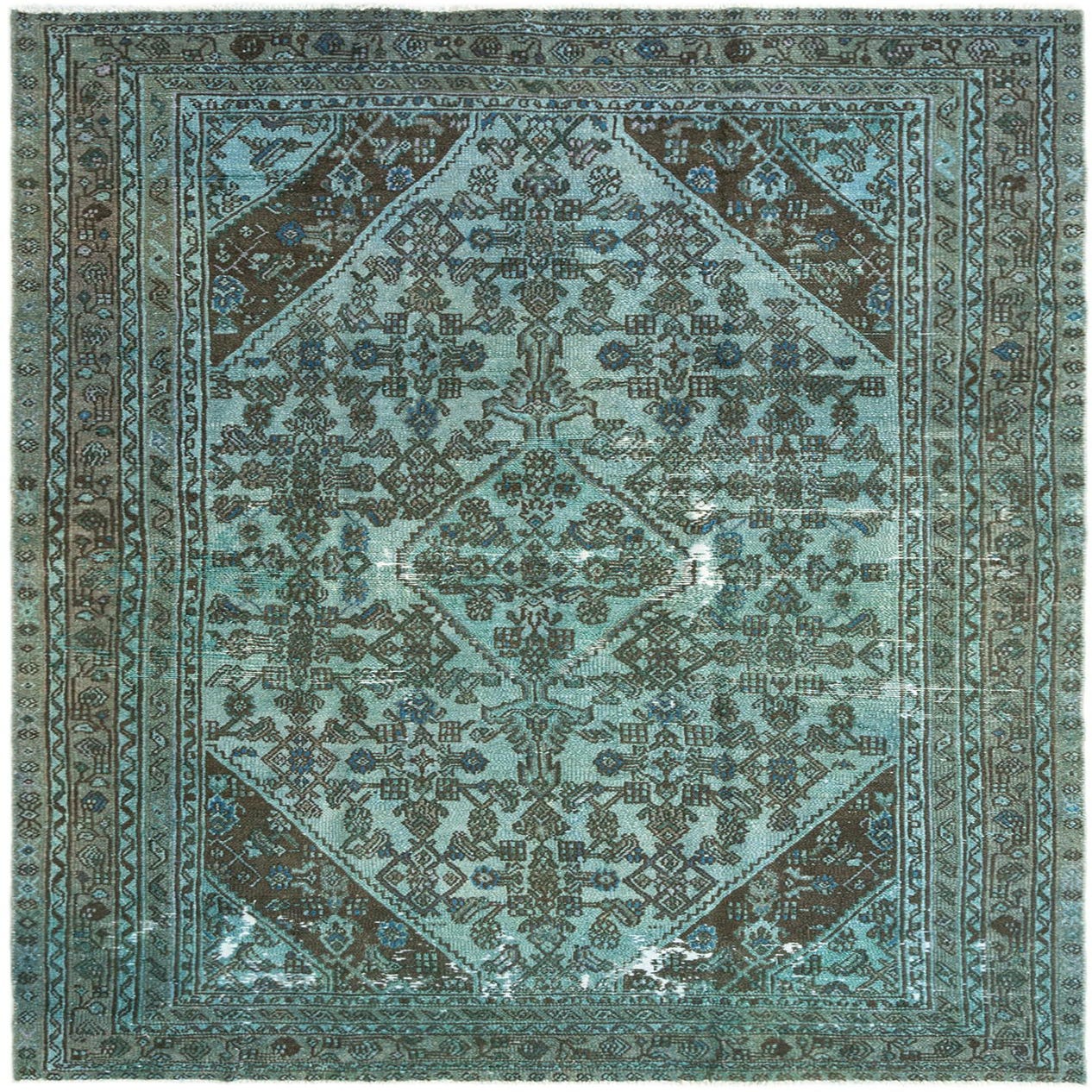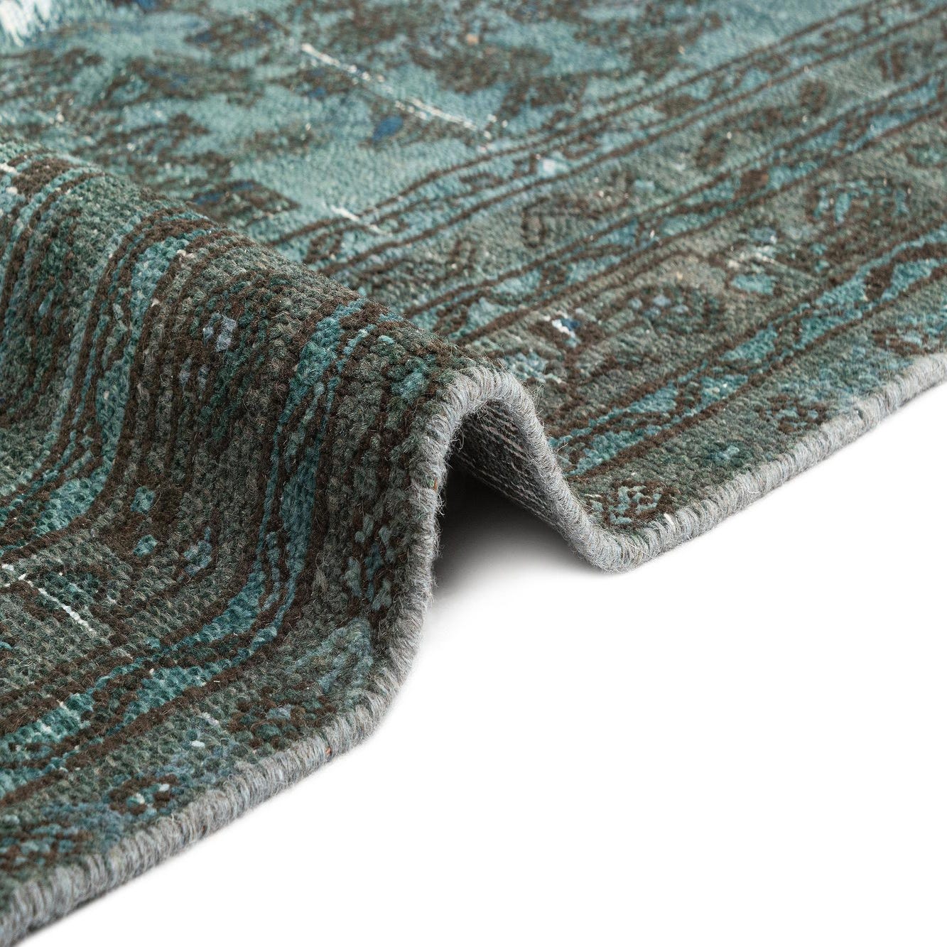 A 7x10 rectangular blue vintage wool rug with a distressed traditional pattern and dark central medallion.