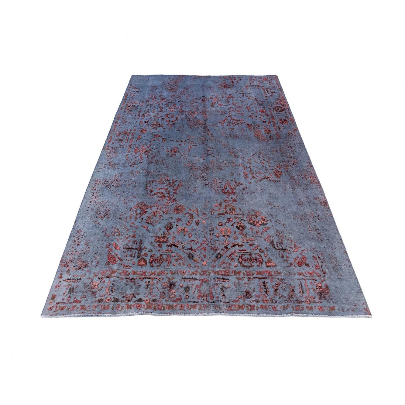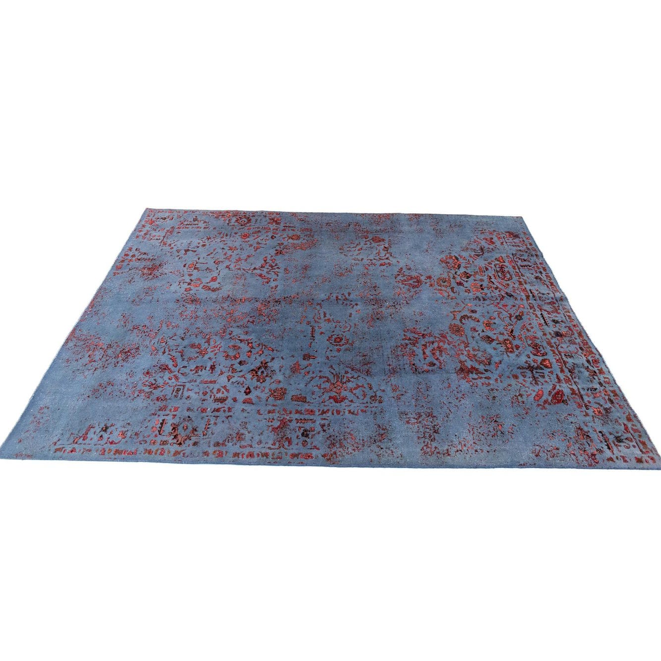 A 7x10 rectangular blue Persian wool rug with distressed red and orange floral patterns, suitable for a living room.