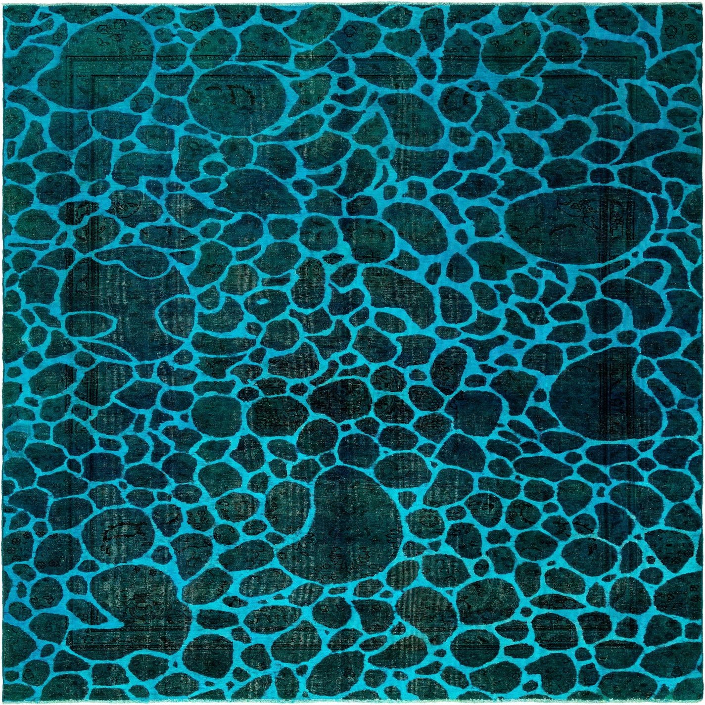 A 7x10 rectangular blue Persian wool rug featuring a distressed, abstract pebble-like pattern in varying shades of blue and teal.
