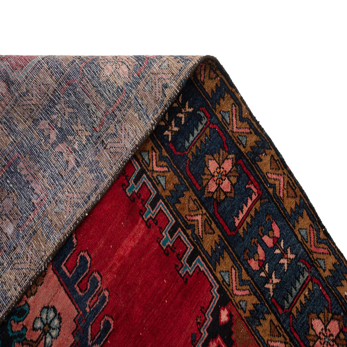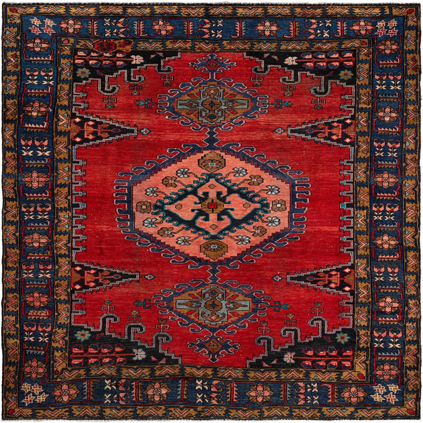 Primary color is Blue. Colors in this rug include: Blue, Brown, Red, Beige, Black.