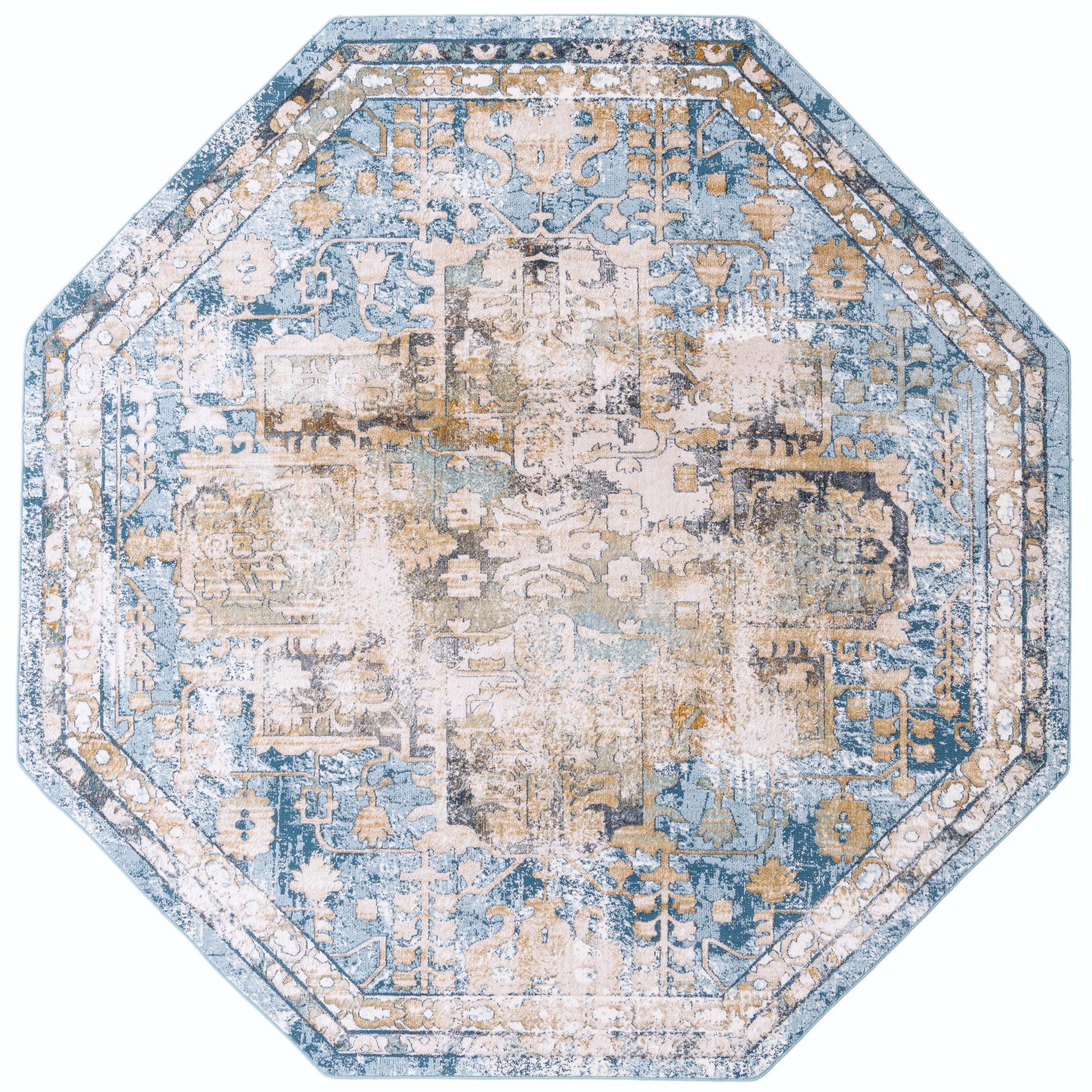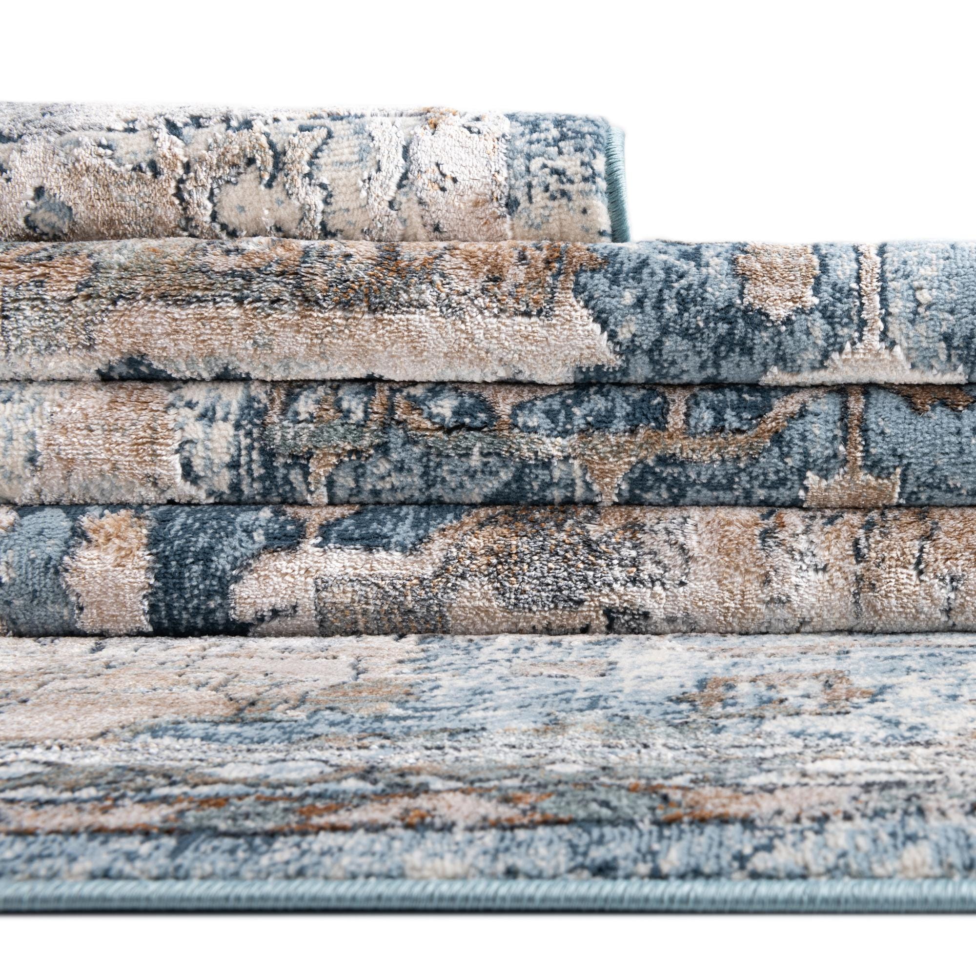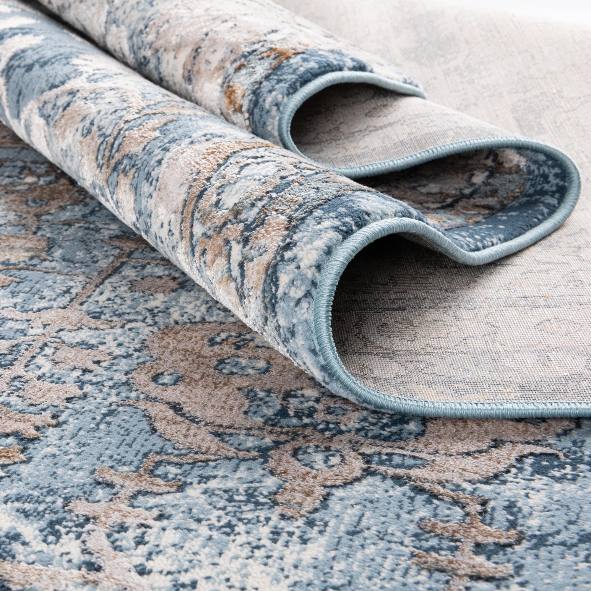 The rug presents a charming distressed pattern with a rich blue background, gracefully combining hues of beige, ivory, light blue, and subtle touches of brown. This color palette allows for easy coordination with a range of home furnishings and décor styles, from traditional to modern minimalist.