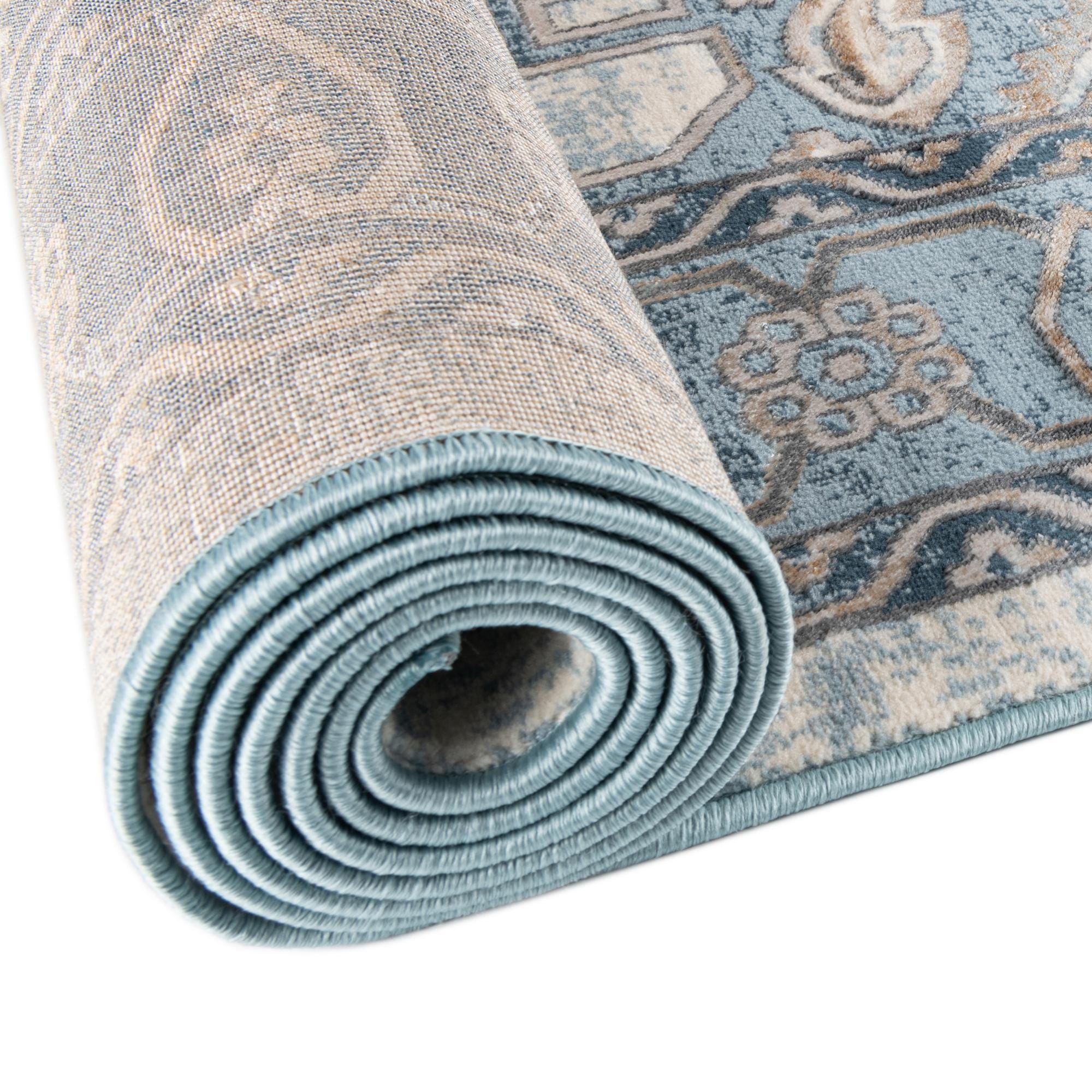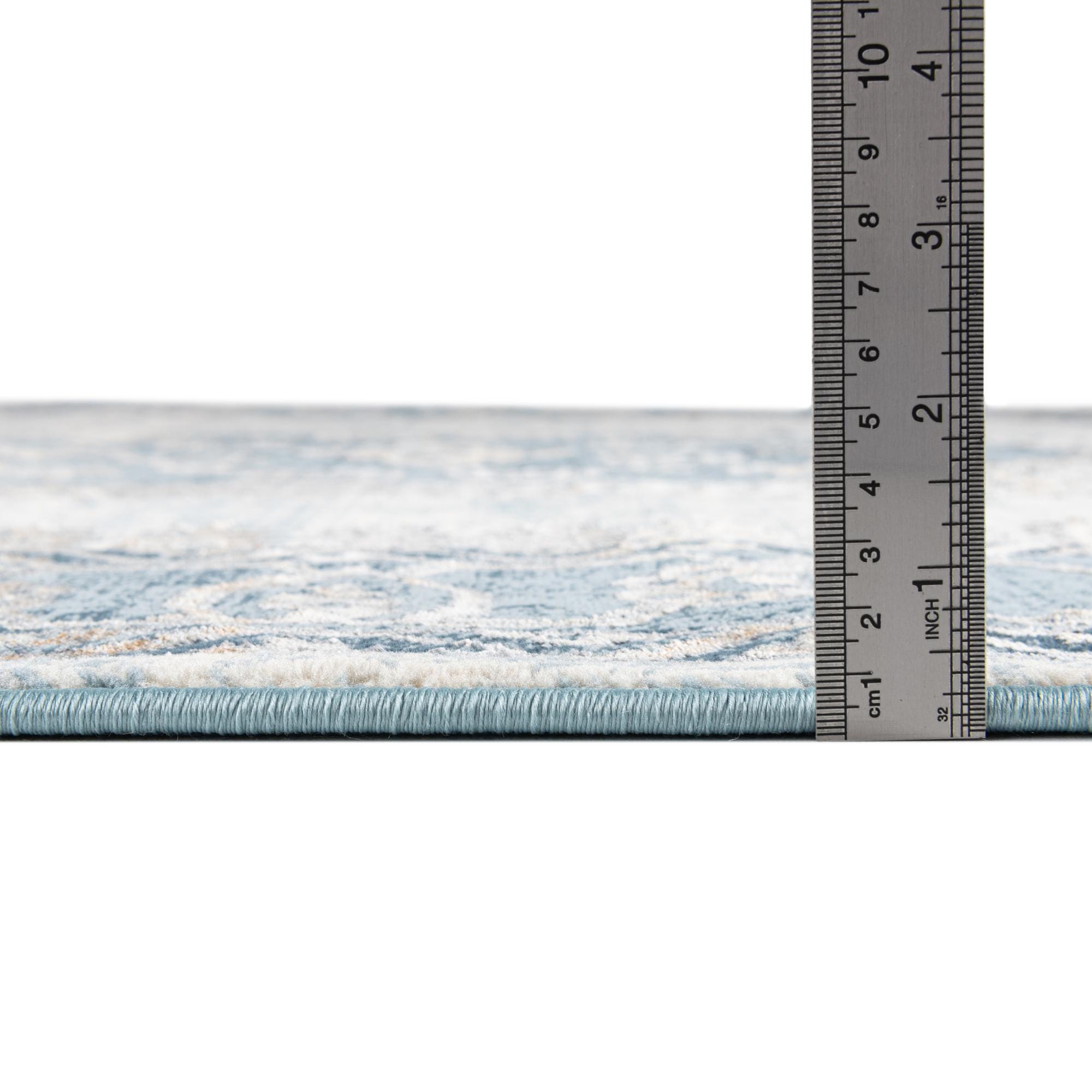 The rug’s design consists of an intricate pattern with a medley of decorative motifs and borders. It showcases a rich palette that includes shades of blue, ivory, light blue, light brown, navy blue, and gray, set against a main background color of blue which gives the rug a sense of depth and dimension.