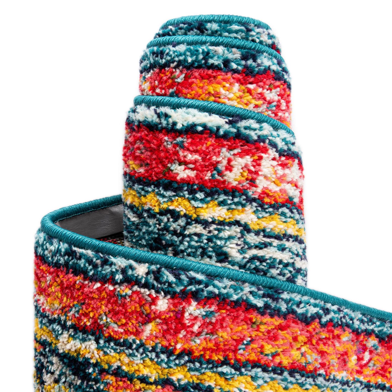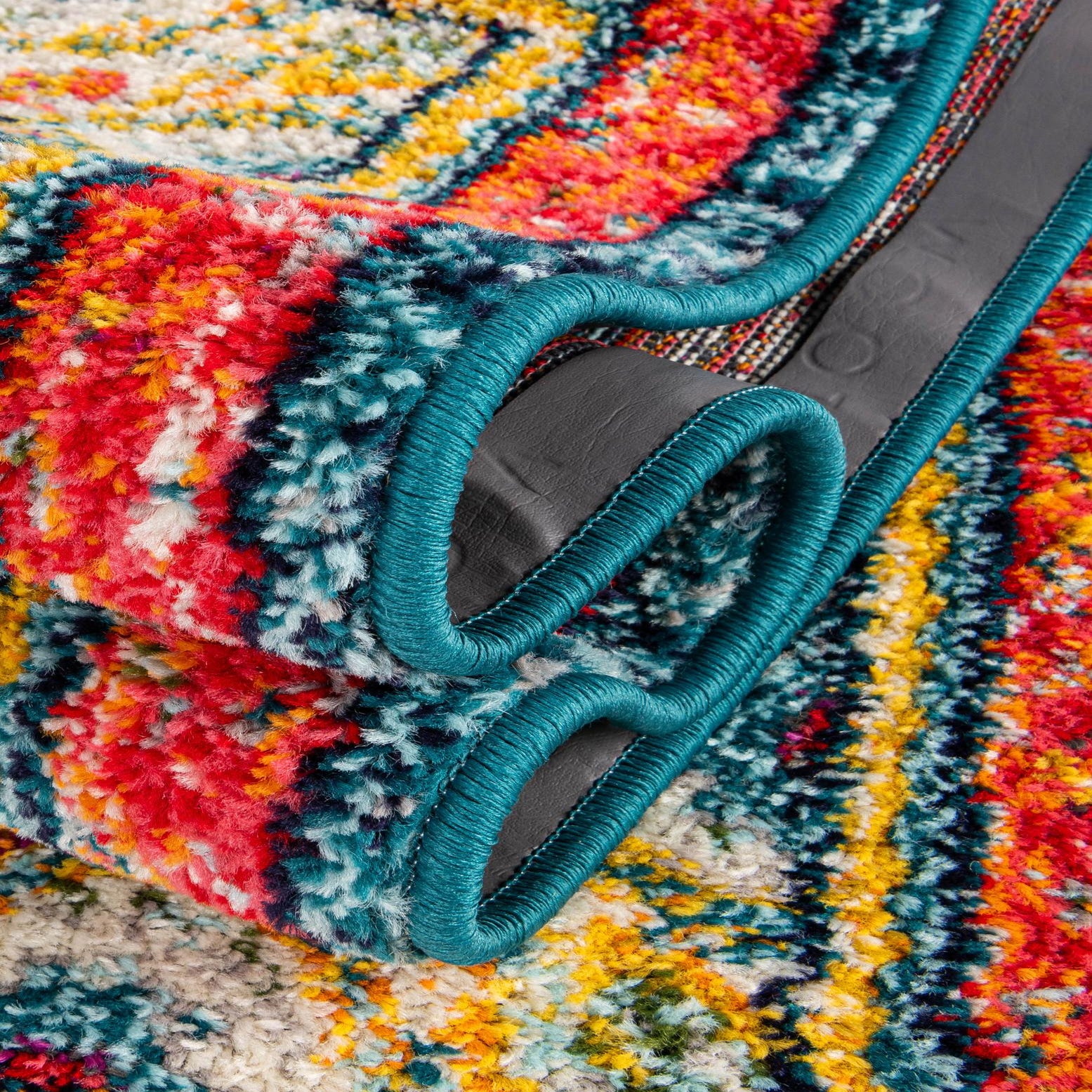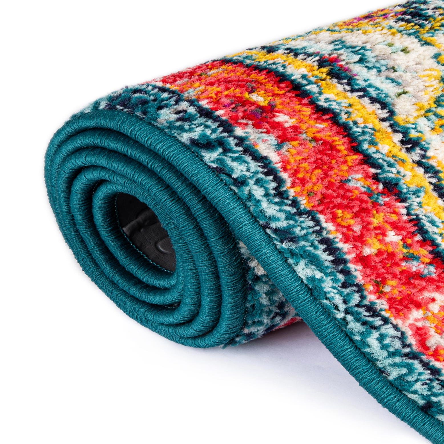 This rug works well in a variety of interiors — anchor a seating area in a modern-traditional living room, place it beneath a round dining table to echo the curved lines, or add a bold focal point in an entry or home office. It pairs nicely with warm wood tones and brass accents, complements navy or ivory upholstery, and suits eclectic and bohemian schemes that welcome layered pattern and color.