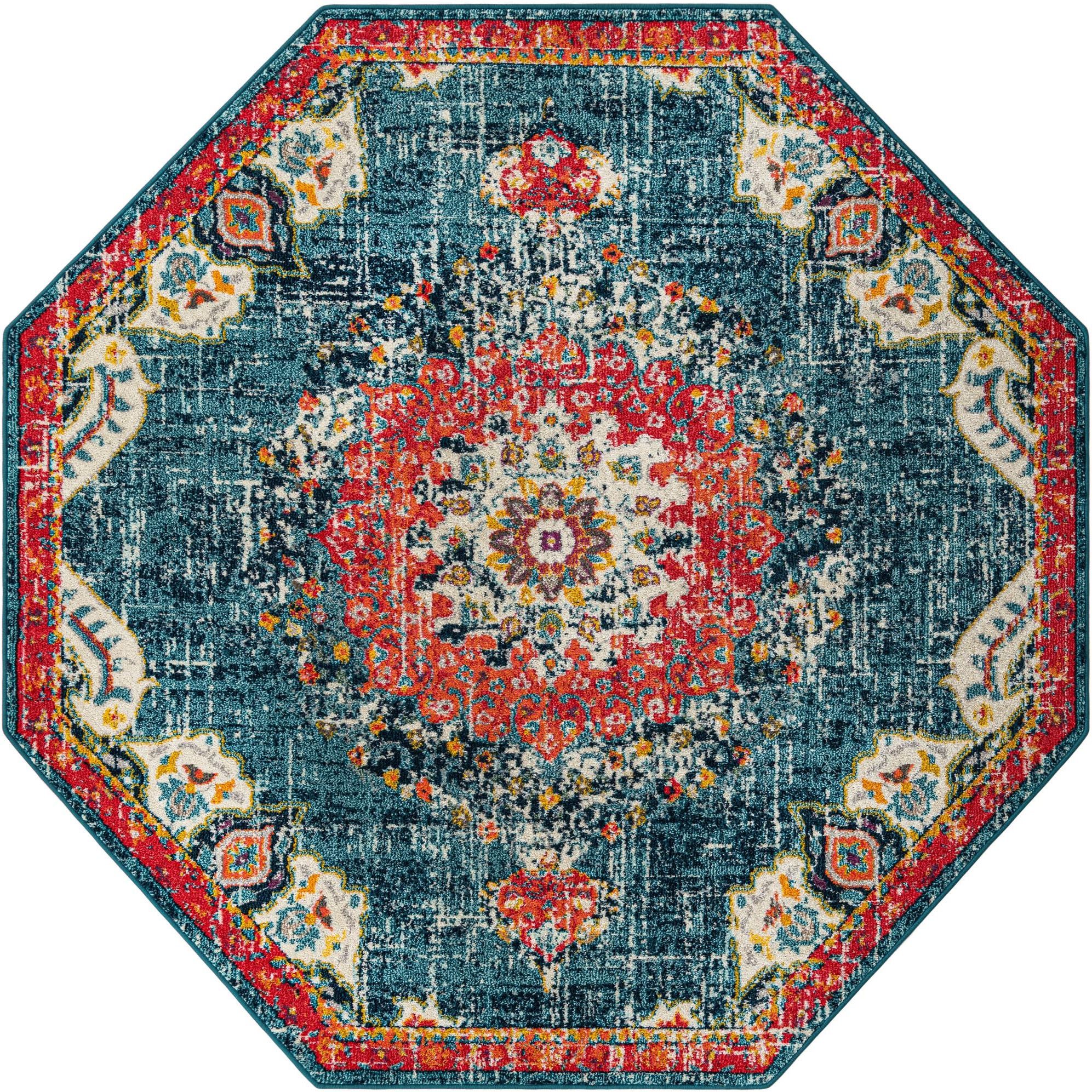 A classic medallion pattern is centered on a blue background, where a lively mix of red and orange forms the floral focal point, softened by ivory highlights and punctuated with gold, green, navy blue and pink accents. The octagonal silhouette adds architectural interest while a subtly distressed finish gives the rug a vintage-inspired character. Machine-made from 100% polypropylene, the surface has a low, even pile that feels smooth and slightly cushioned underfoot and holds color saturation for a lively look.
