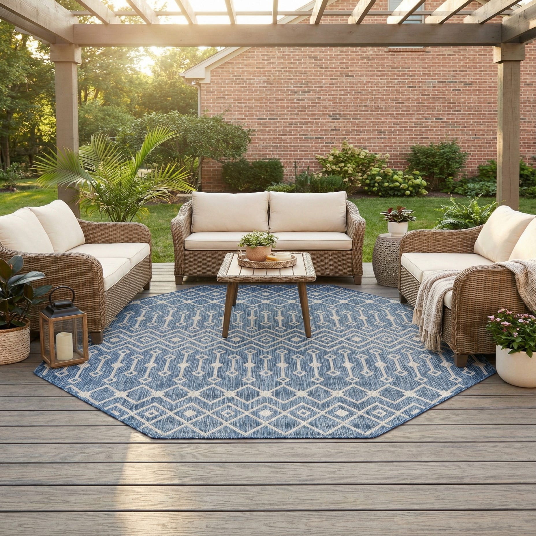 An octagon-shaped blue and white tribal pattern rug, perfect for indoor or outdoor use on a patio.