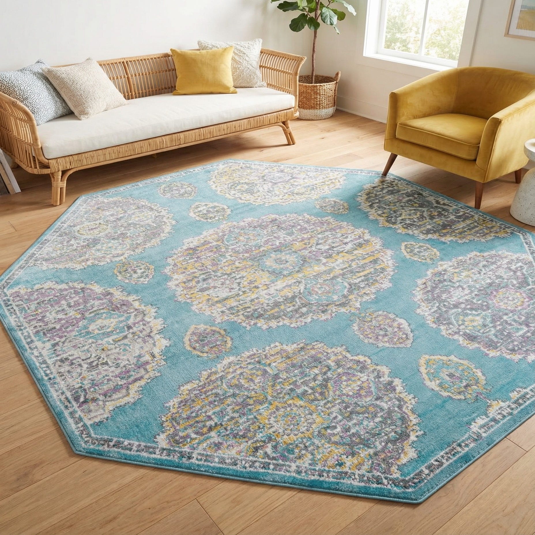 A relaxed, vintage-inspired medallion pattern sits against a blue field, with large circular motifs balanced by smaller teardrop accents for a composed, rhythmic layout. The design mixes soft ivory and gray with hints of purple, yellow and green that layer into the pattern to create a gently weathered effect. The octagonal silhouette and narrow bordering give the piece a distinctive footprint that works as a subtle focal point without overwhelming a room.
